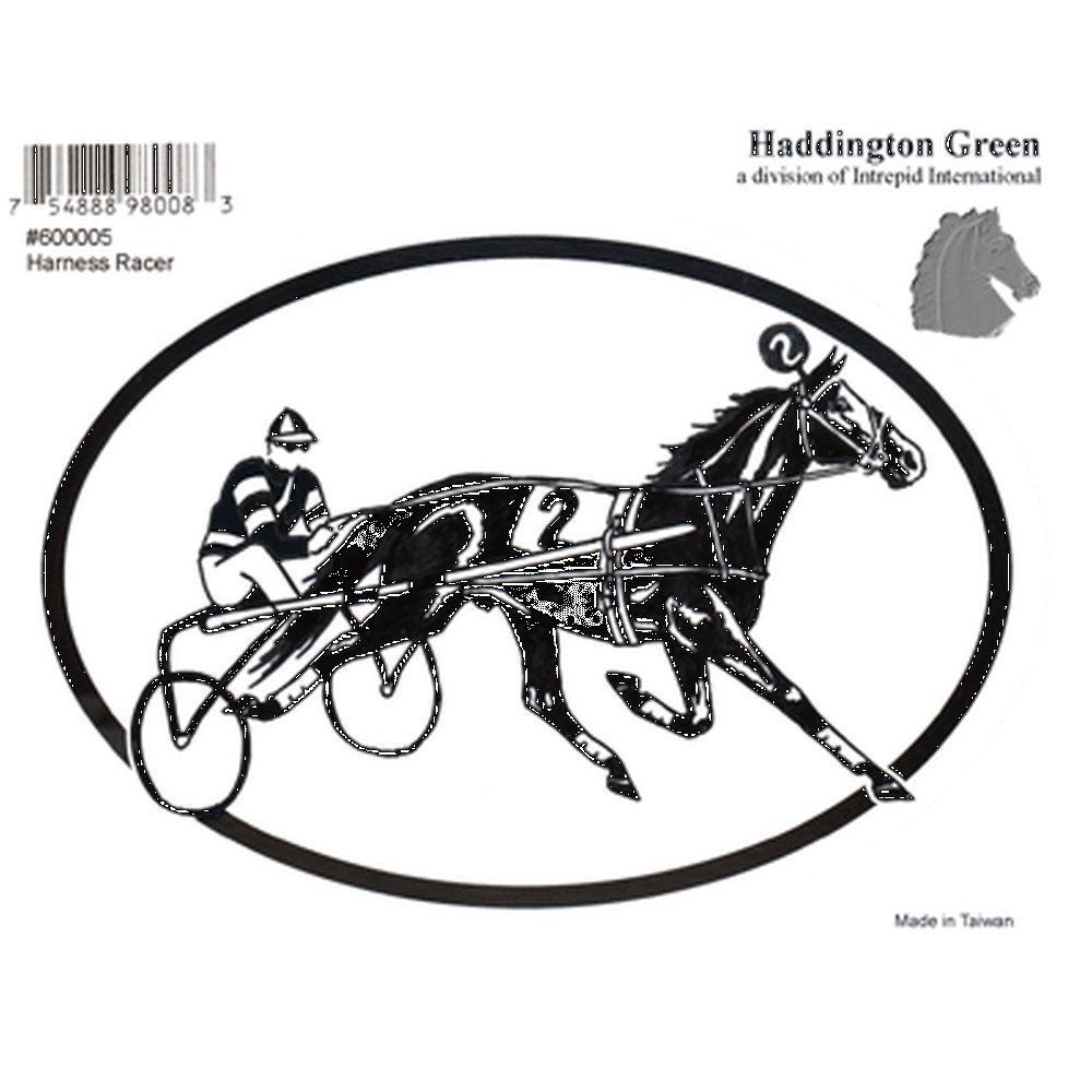 The 3 1/2″ x 5″ oval decal features a drawing of a harness racing horse and jockey. Great for trailers, cars, book covers and more.