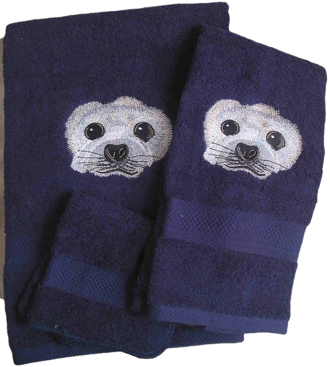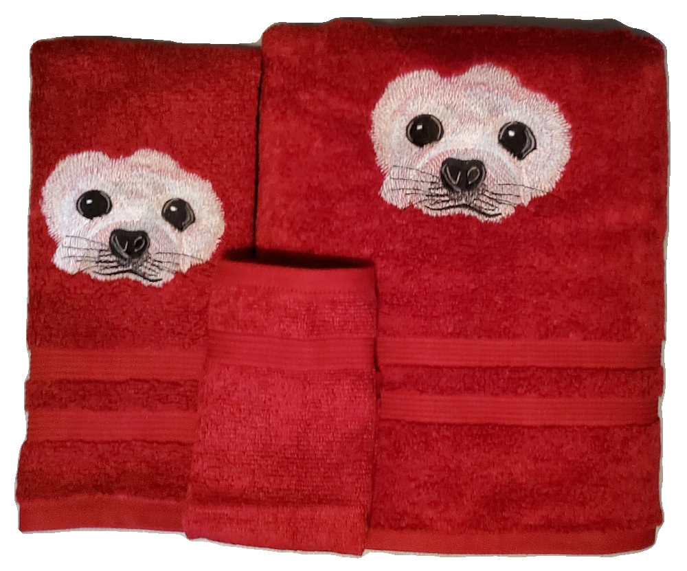 Embroidered bath towels featuring an embroidered Harp Seal. Soft, basic, 100% cotton terry bath towel set. Towels are a medium weight terry for best appearance of the embroidery. Designs are sewn in long lasting polyester thread.