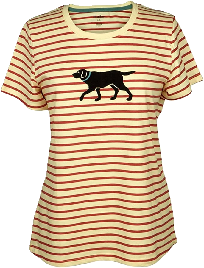 This striped jersey tee has an appliqued black lab on the front. Contrasting crew neck jersey tee has short sleeves Pajama tees wash well, keep their shape and experience minimal shrinkage. Made with 100% stripe cotton jersey, this cute and comfy tee is sure to please any dog lover. Matching pants are available.