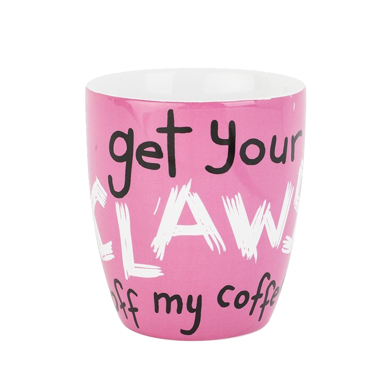 Ceramic mug features a black cat with the words “Get Your Claws Off My Coffee!”. The mug holds 14 oz. of liquid and is 3-3/4″ high. Comfy-sized handle for your morning beverage of choice. Suitable for hot or cold beverages. Made of ceramic. Dishwasher safe.