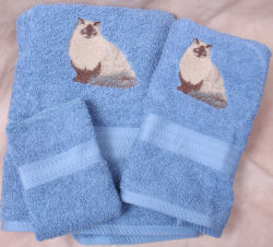 Embroidered bath towels featuring an embroidered Himalayan Cat. Designs are on a soft, basic, 100% cotton terry bath towel set. Towels are a medium weight terry for best appearance of the embroidery. Designs are sewn in long lasting polyester thread.