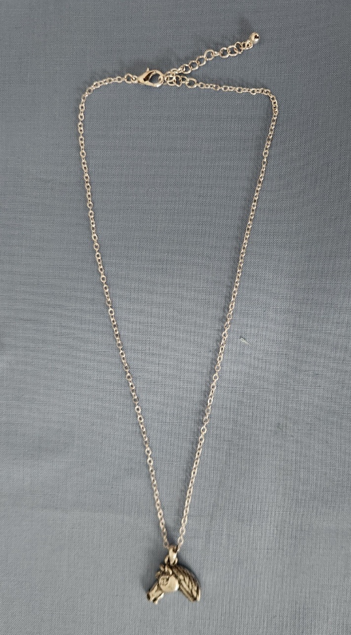 Horses head necklace with single Rhinestone. The necklace chain adjusts from 16″ to 17 1/2″.  Boxed in cowboy hat shaped velvet gift box.