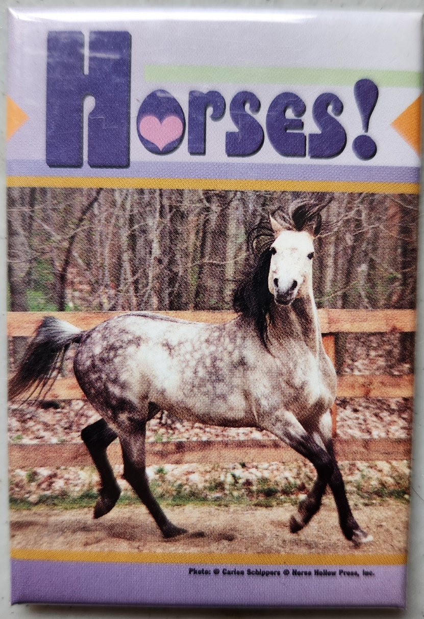 The 2 1/8″ x 3 1/8″ magnet exclaims “Horses!”. Beautiful grey horse is great to display on the refrig or any metal surface.