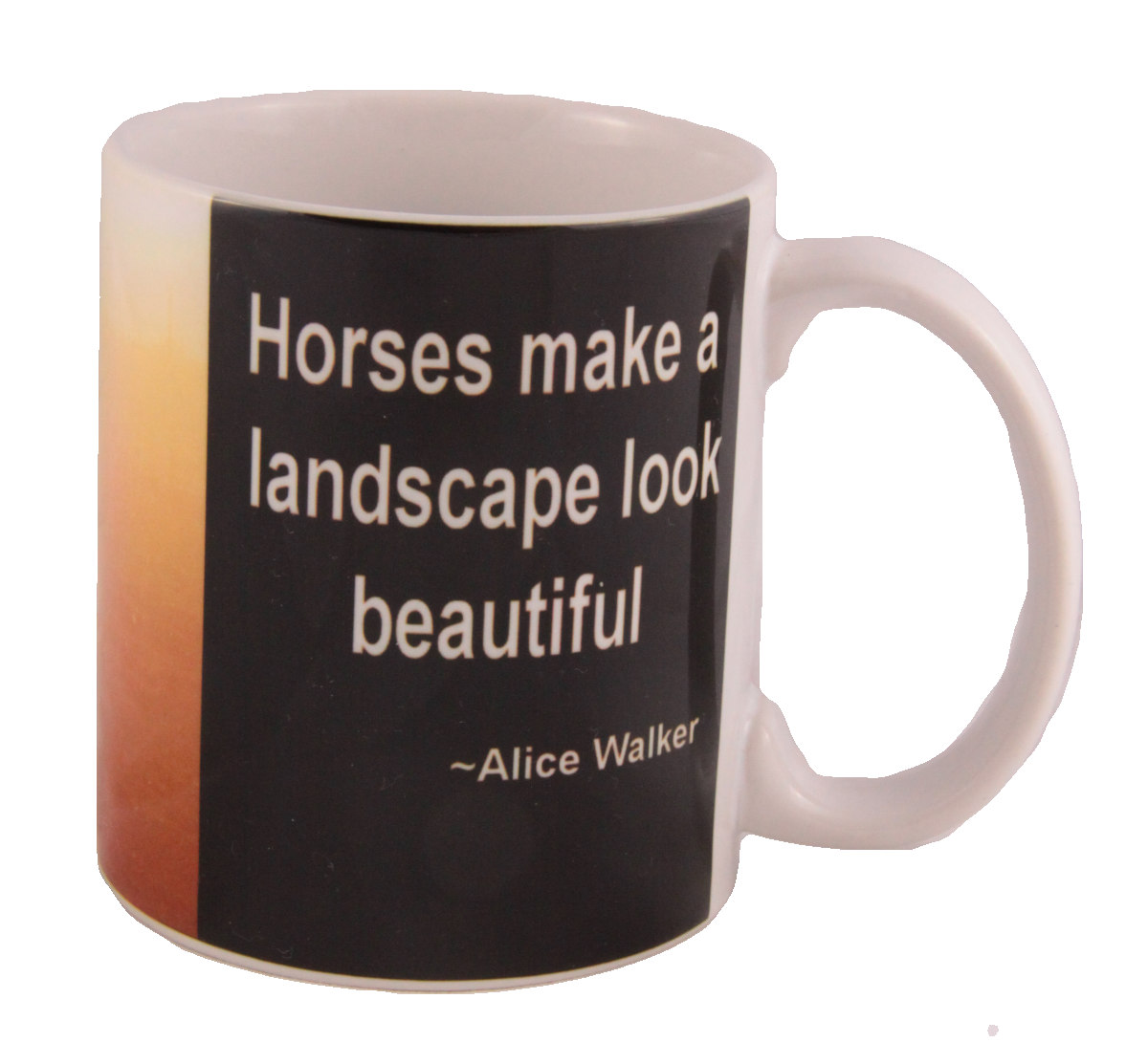 Ceramic mug features a horse in the morning mist with the words “Horses make a landscape look beautiful”. Quote is by Alice Walker, The mug holds 12 oz. of liquid and is 3-3/4″ high. Microwave and dishwasher safe.