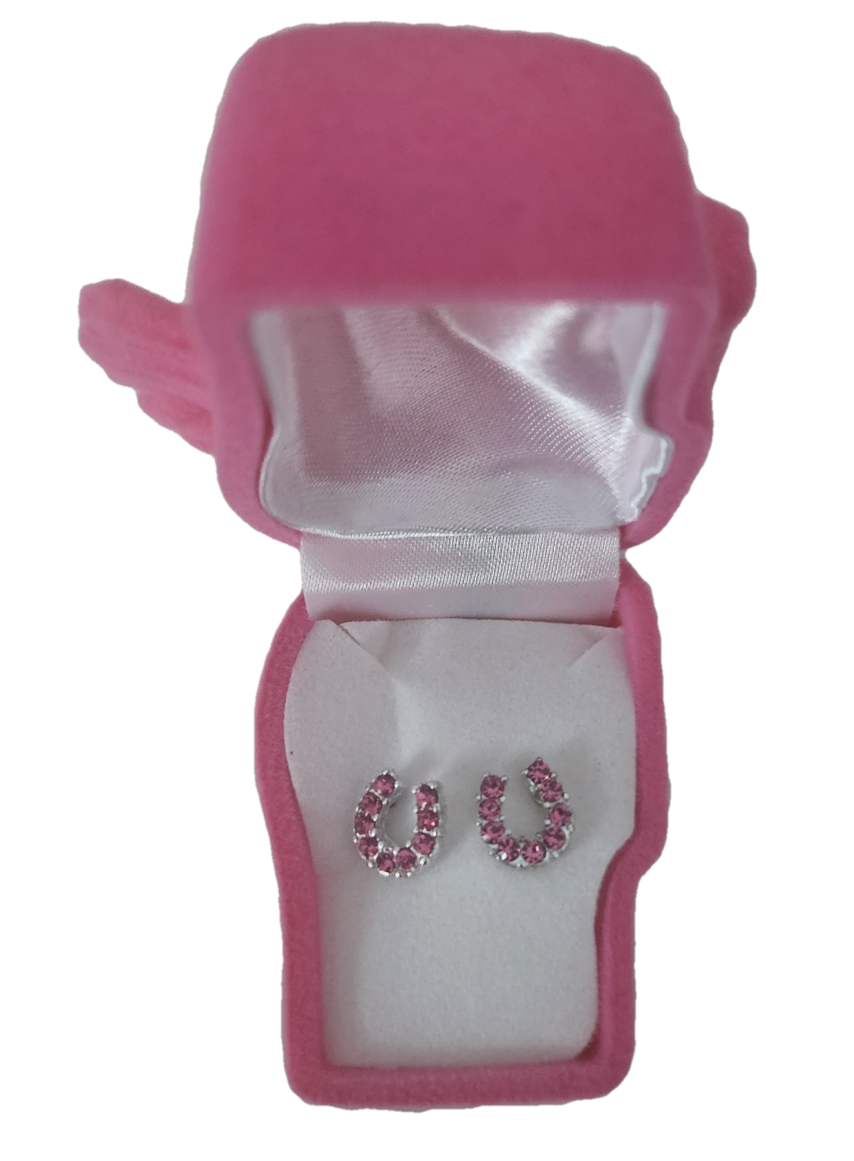 Horseshoe Rhinestone Earrings are beautifully detailed earrings in blue or pink rhinestones. Earrings come with 3/8″long posts with plastic and metal stay. Boxed in horse head shaped velvet gift box.