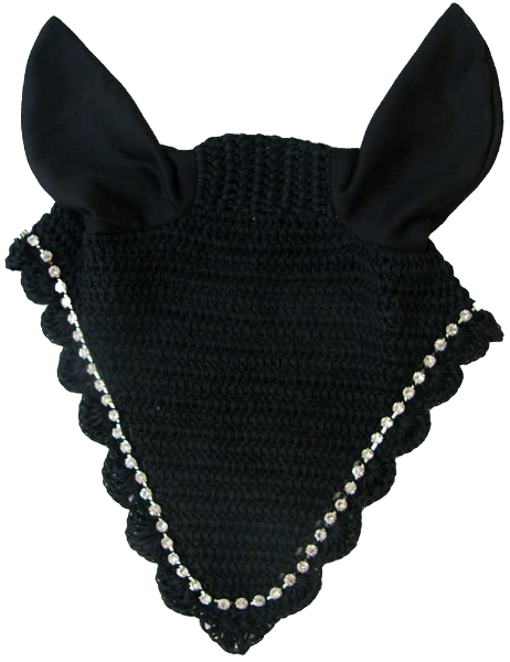 Help protect your horse from those nagging flies with a crocheted horse fly veil with covered ears. Does not have fringe. This is a black fly veil trimmed with rhinestones.