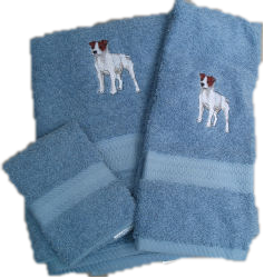 Embroidered bath towels featuring an embroidered Jack Russell Terrier dog. Towels are 100% soft cotton, basic terry. Towels are a medium weight terry for best appearance of the embroidery. Designs are sewn in long lasting polyester thread.