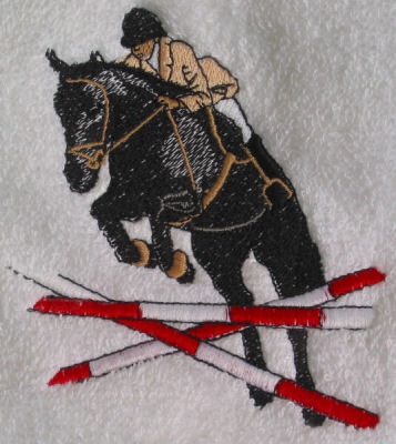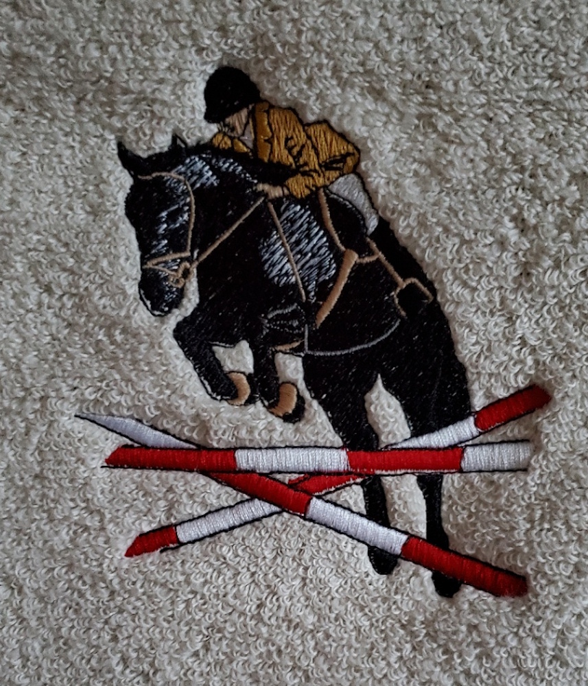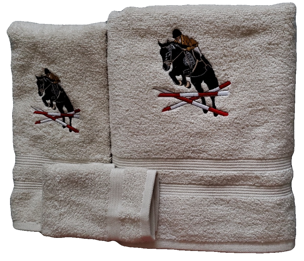 Embroidered bath towels featuring an embroidered Jumping Horse & Rider. Towels are 100% soft cotton, basic terry. Towels are a medium weight terry for best appearance of the embroidery. Designs are sewn with long lasting polyester thread.