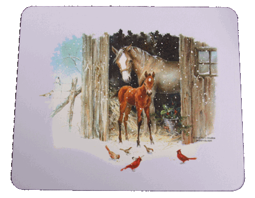 Kitten, foal and mare horse mouse pad. The design is called “Medley in Gold”. Pad measures 9″ wide x 8″ tall. Pad face is cloth with rubber backing.
