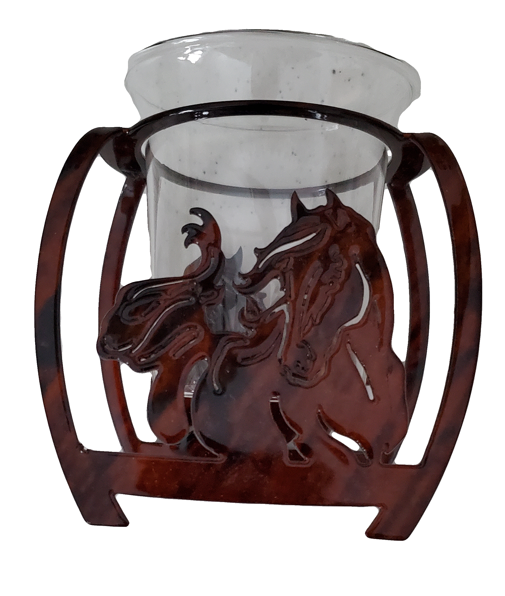 This has a bronze lazer finish on a metal candle holder. The size is about 3 1/2″ high and about 3 1/2″ wide. Clear glass holder fits votive candles. Add candle light with a equine accent to any room.