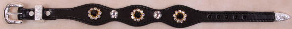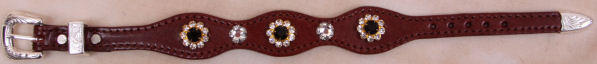 Western styled brown leather bracelet with German silver trim, buckle, and strap tip. Rhinestones are dark blue and clear with gold colored setting.