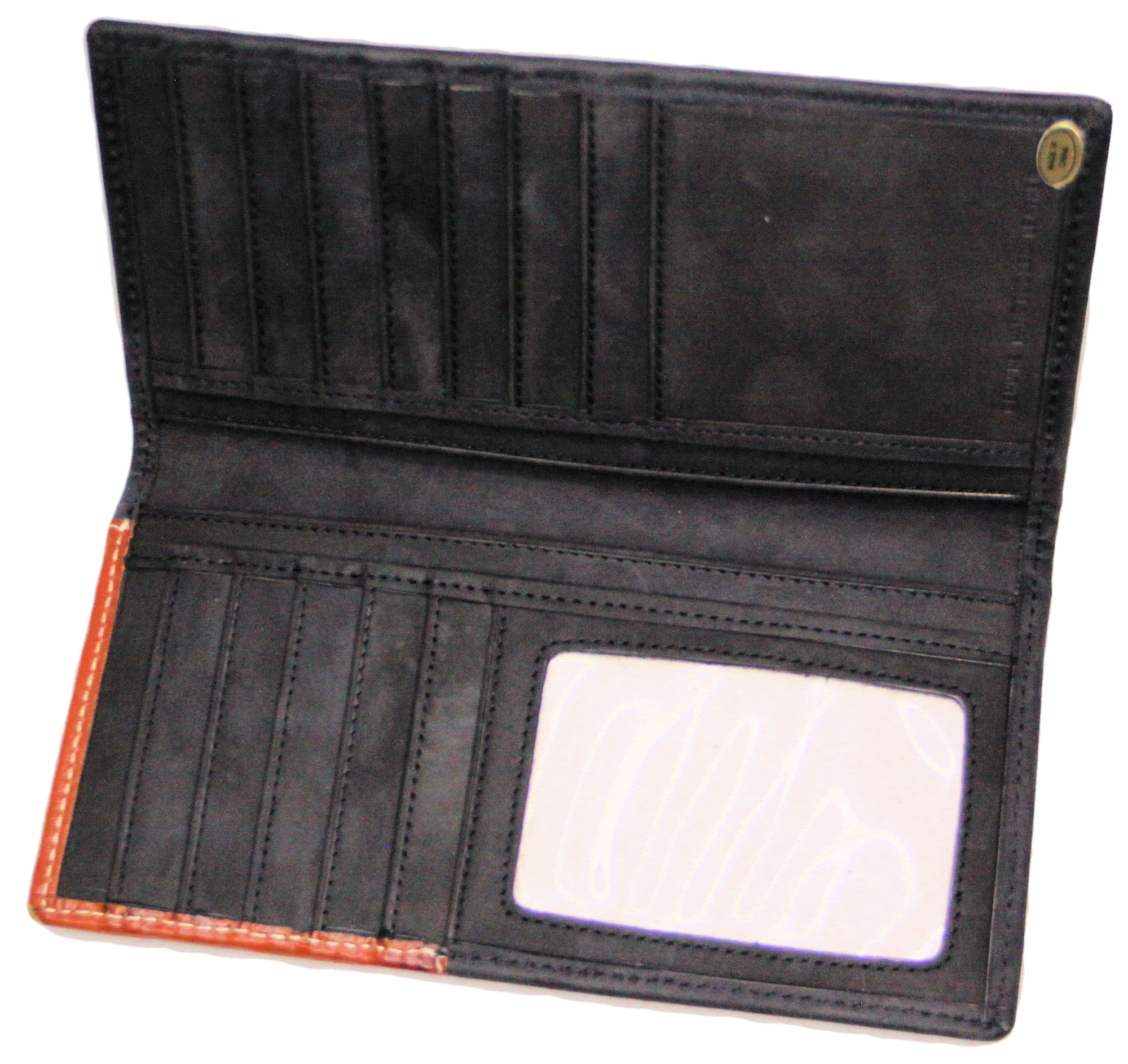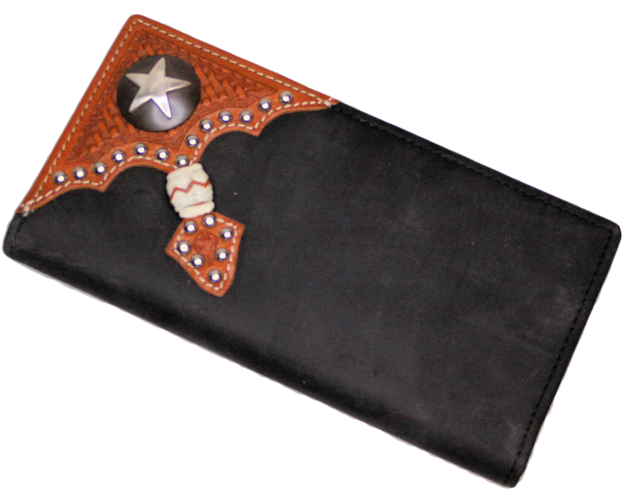 Black leather wallet with tooled basket weave corner and star concho. Long bi-fold Wallet is 4″ wide by 7 1/4″ long. Inside has four long pockets for cash and 14 pockets for credit cards and/or ID.