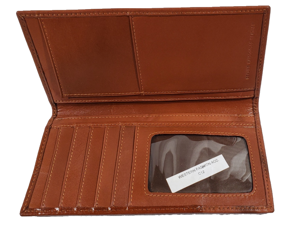Brown leather bi-fold long wallet with brown tooled cover with metal studs and Texas Star concho. Wallet is 3 3/4″ wide by 7 1/4″ long. Inside has four long pockets and 7 pockets for credit cards and id. Comes in gift box.