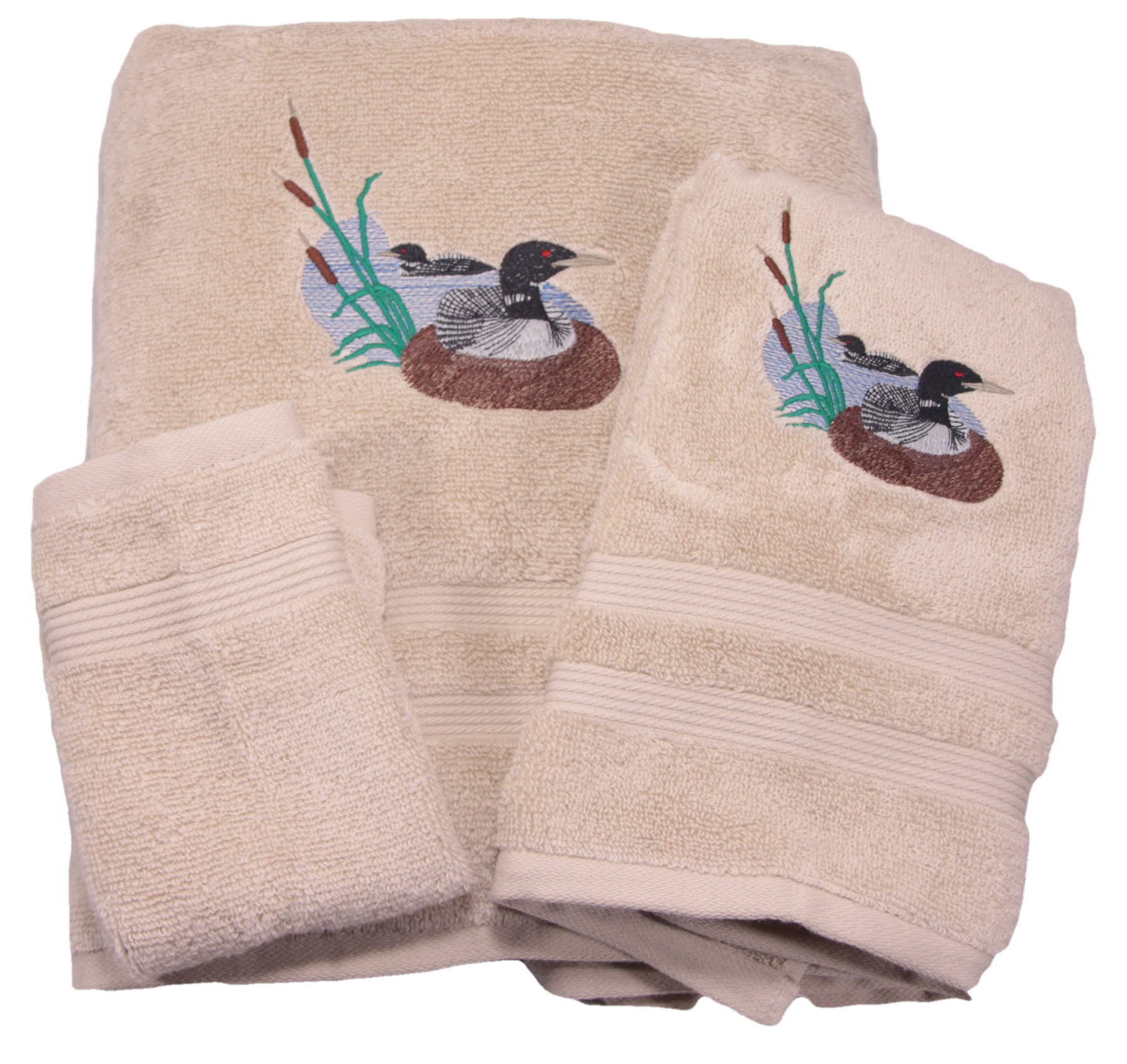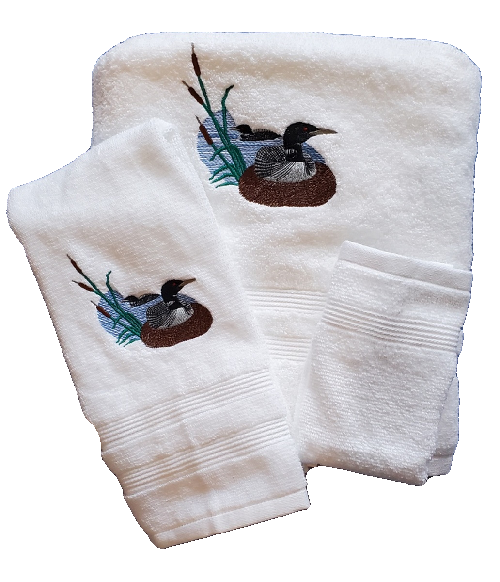 Embroidered bath towels featuring an embroidered Loon. Designs are done on a soft, 100% cotton terry. Towels are a medium weight terry for best appearance of the embroidery. Designs are sewn in long lasting polyester thread.