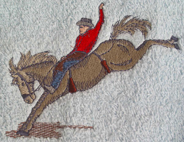 Custom embroidered bath towels featuring a male bareback rider on bronco horse. Designs are on a soft, basic, 100% cotton terry bath towel set. Towels are a medium weight terry for best appearance of the embroidery. Designs are sewn in long lasting polyester thread.