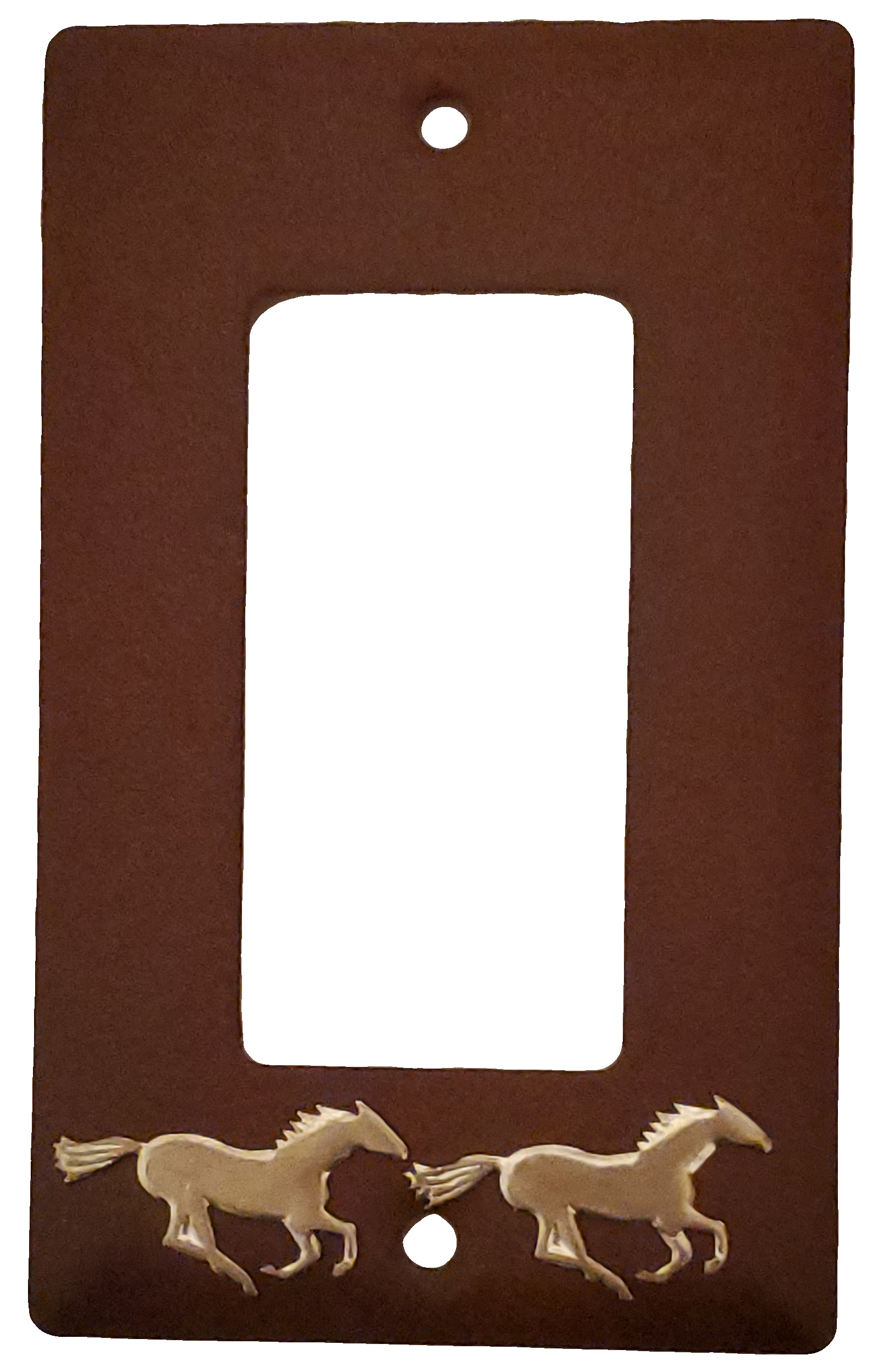 Metal Two Running Horses Single Rocker Switch Plate is available in black or antique brown. The plate is about 4 1/2 inches tall and about 2 3/4 inches wide. Screws are included.