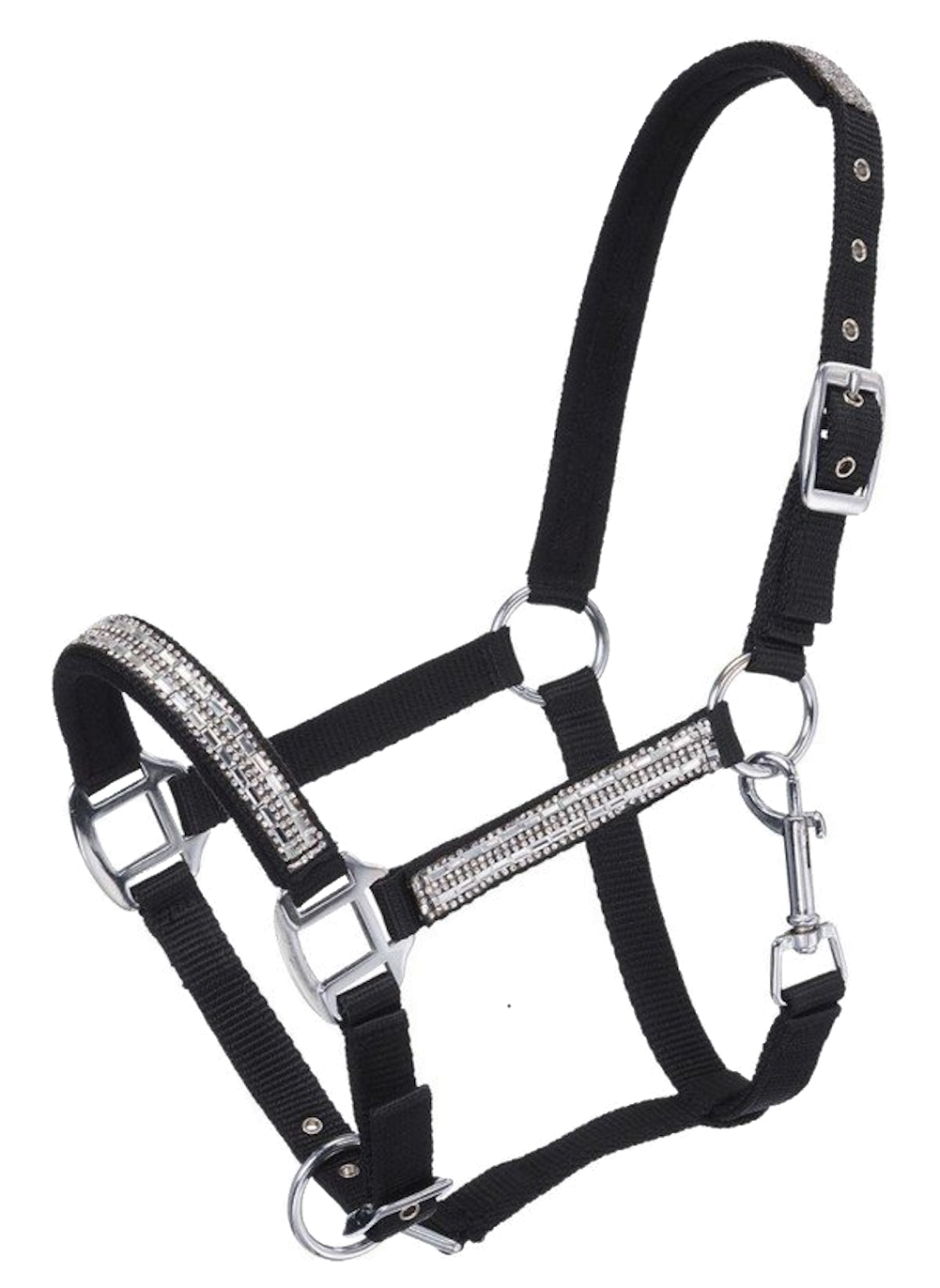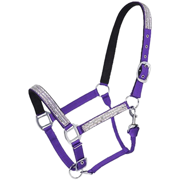 Miniature Horse Halter with Crystal Accents. The halter is made of nylon with crystal overlay. The nose and crown are padded and adjustable and the halter has a throat snap so it can easily be put on or removed.