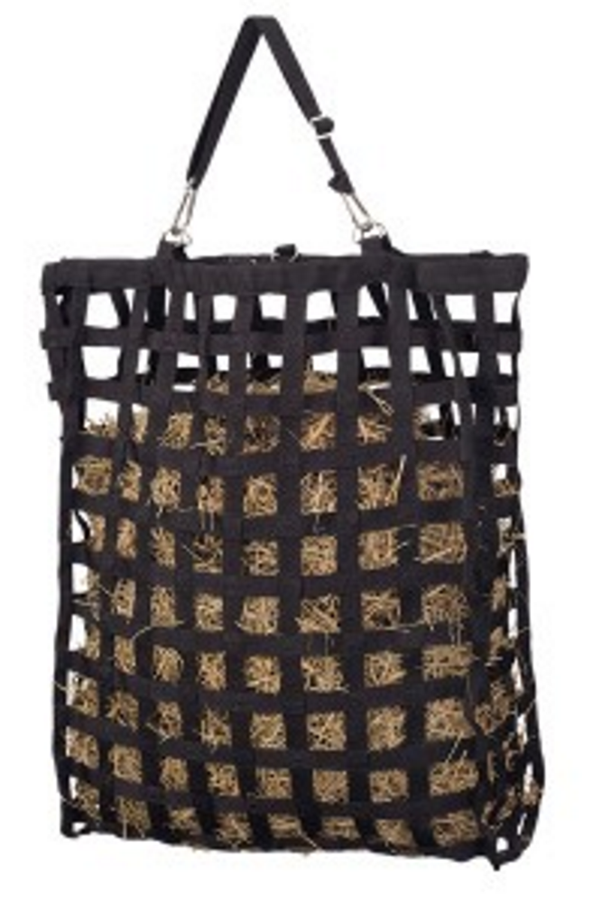 The miniature horse web hay feeder is made from 1 inch webbing in small 1 1/2 x 1 1/2 inch openings. This slows a horse down while eating and makes less waste. Adjustable hanging straps with snaps at both ends close the top so a horse can’t get hay from the top. Includes strap on lower back to secure bag to stall or trailer to keep it from spinning. Feeder is about 22 inches long and 18 inches wide.