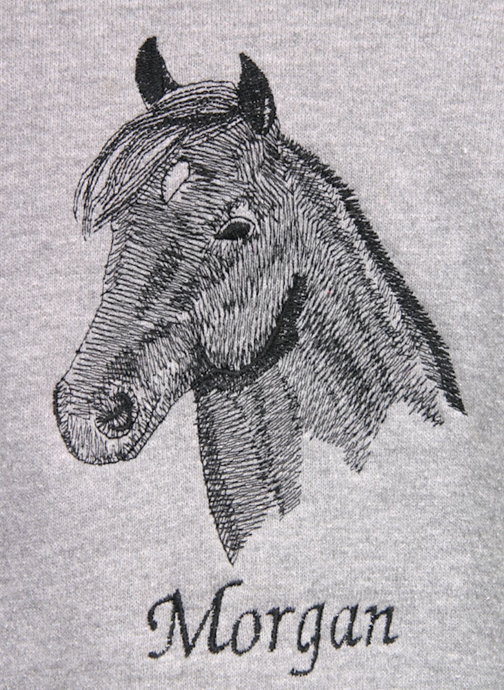 Our embroidered sweatshirts are knit made of 50% pre-shrunk cotton and 50% polyester. The sweatshirt is long sleeve with crew neck and ribbed bottom and cuffs. Embroidery is done with washable polyester thread. Design is a Morgan horse head. Thread color will vary based on sweatshirt color picked. Sizes are adult uni-sex.