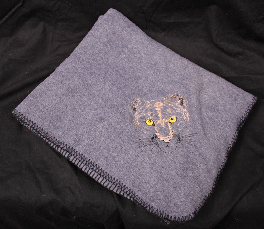 Custom embroidered mountain lion face design on 100% Polyester warm fleece throw. The design is sewn with color fast polyester thread. The approximate size 50 x 60 inches. Machine washable.