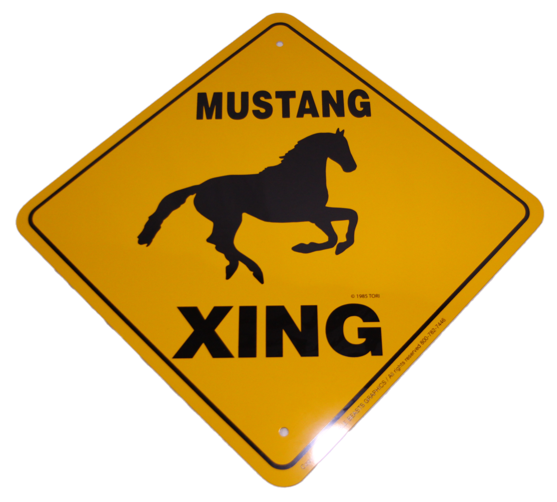 Non-rusting aluminum road sign displays galloping Mustang. The sign reads Mustang Xing. Actual size is a 12 x 12 Inch diamond. The yard crossing sign is a unique gift.