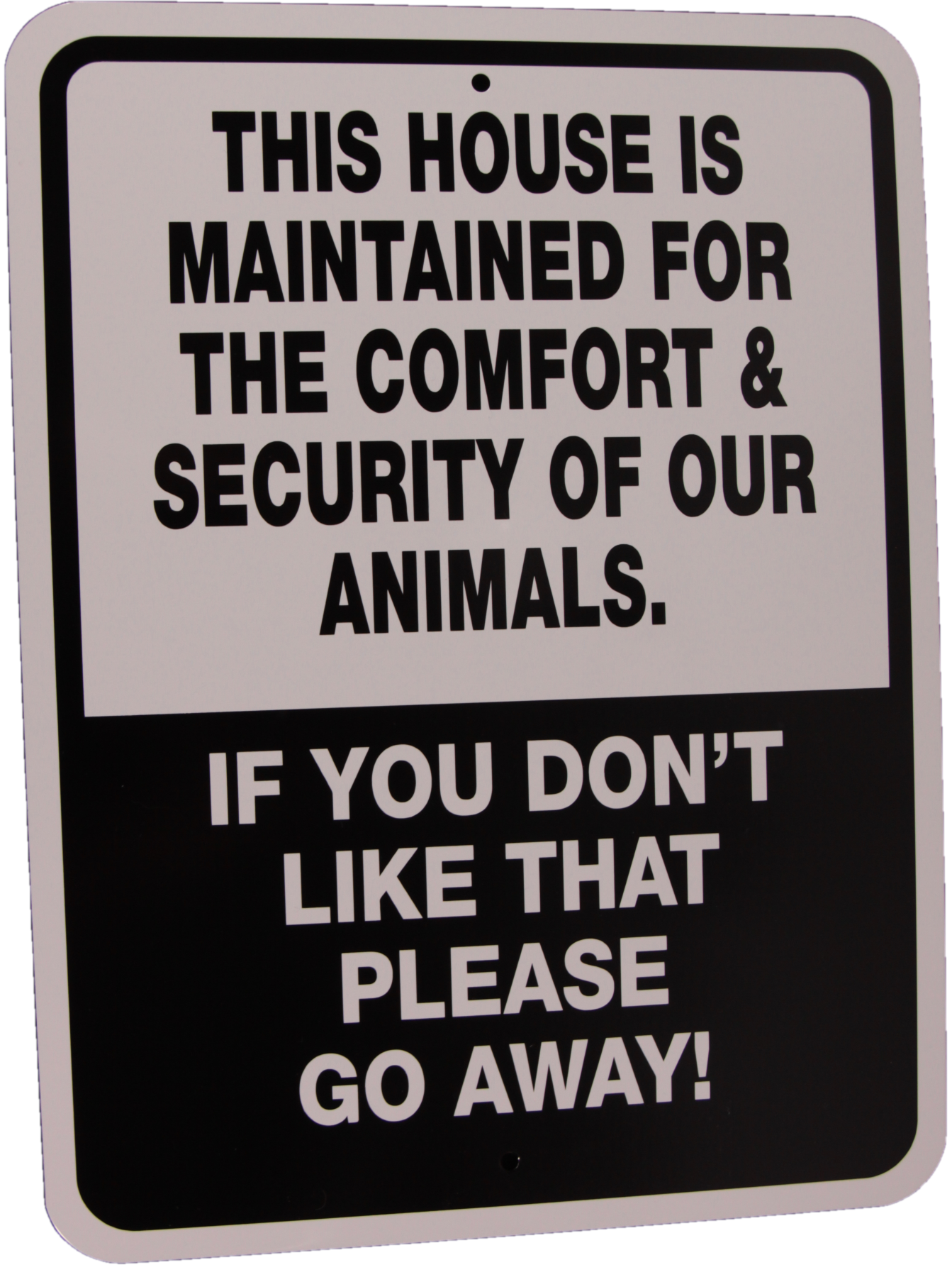 Black and White Sign is made of non-rusting aluminum. The sign read ” This house is maintained for the comfort & security of our animals. If you don’t like that please go away!”. Actual size is a 9 x 12 Inch rectangle.