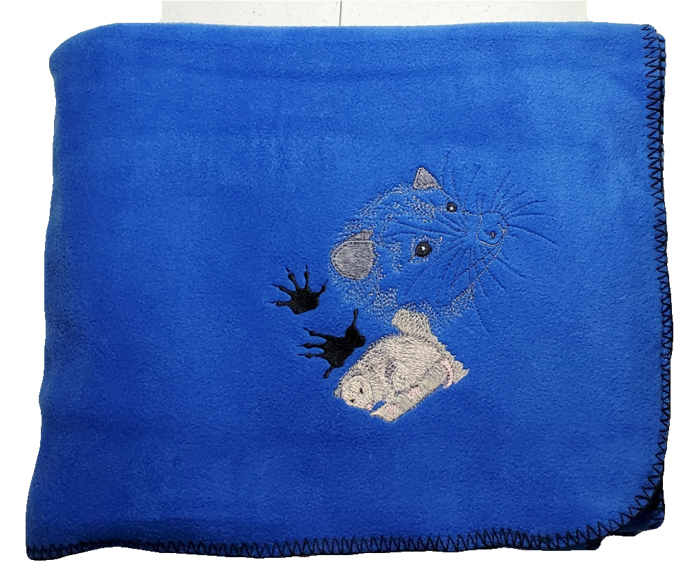 Custom embroidered Opossum with paw print design on 100% Polyester warm fleece throw. The design is sewn with color fast polyester thread. The approximate size 50 x 60 inches. Machine washable.