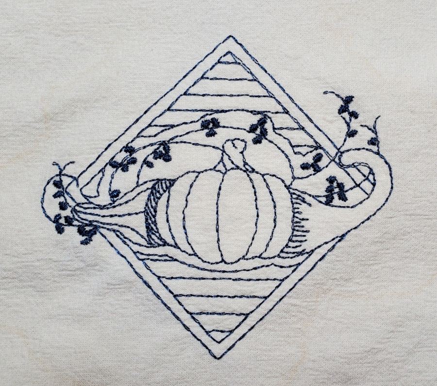 White cotton dish towel with embroidered pumpkin and gourdss.