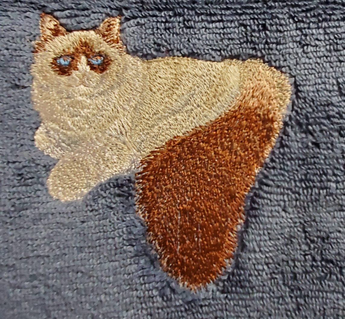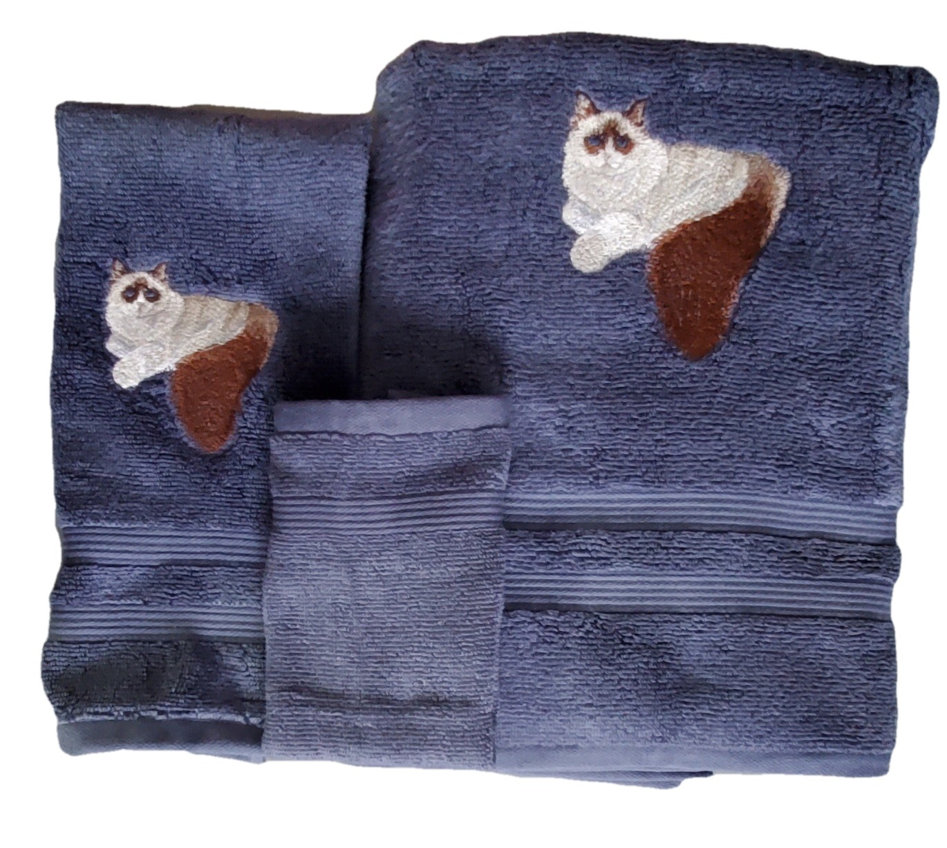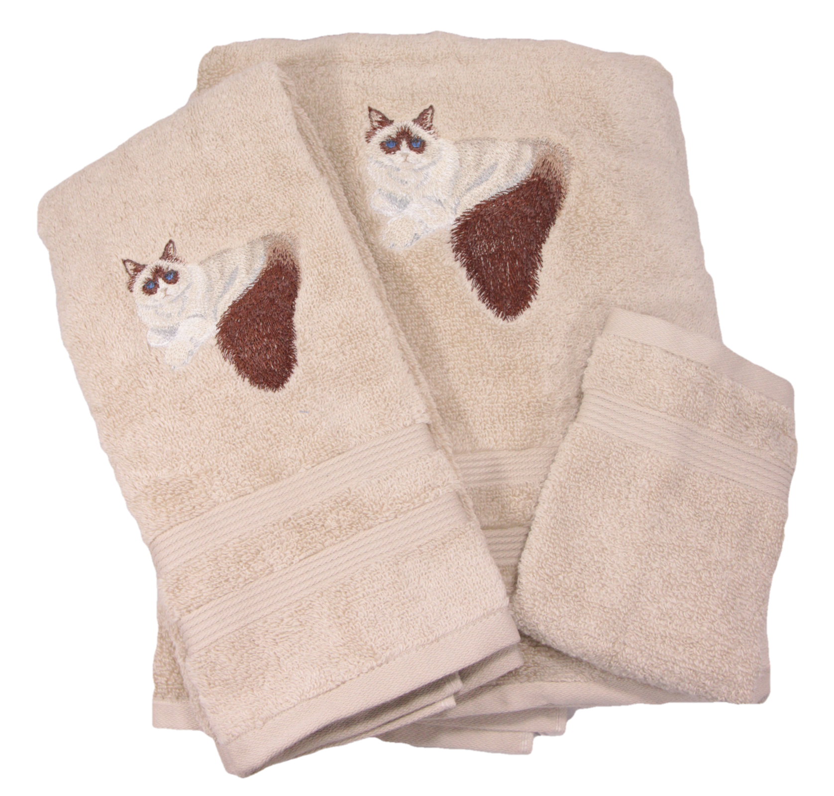Embroidered bath towels featuring an embroidered Ragdoll cat. Designs are on a soft, basic, 100% cotton terry bath towel set. Towels are a medium weight terry for best appearance of the embroidery. Designs are sewn in long lasting polyester thread.