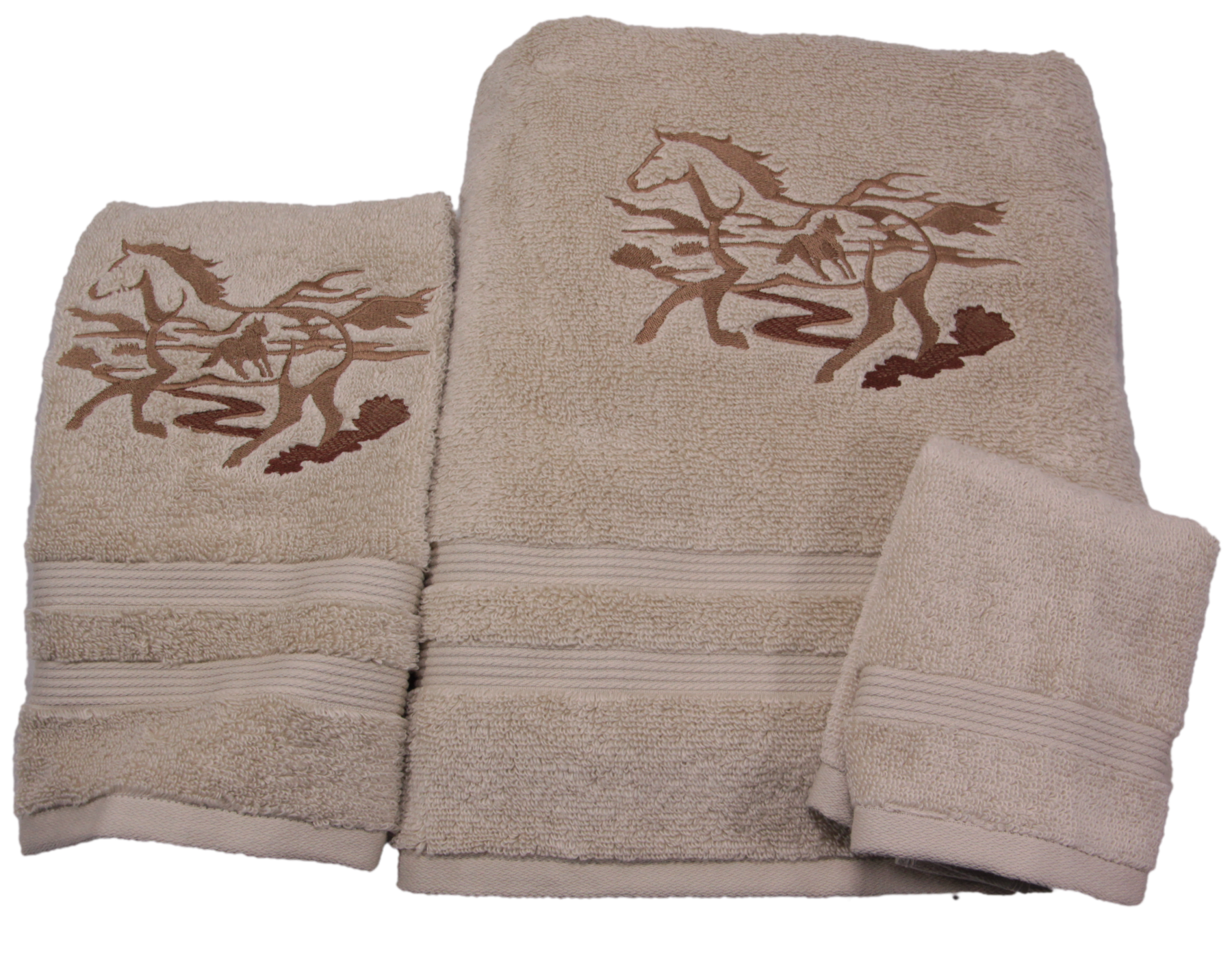 Embroidered bath towels featuring an embroidered galloping wild horse design . Designs are on a soft, basic, 100% cotton terry bath towel set. Towels are a medium weight terry for best appearance of the embroidery. Designs are sewn in long lasting polyester thread. Horse thread color may vary based on towel color selected.