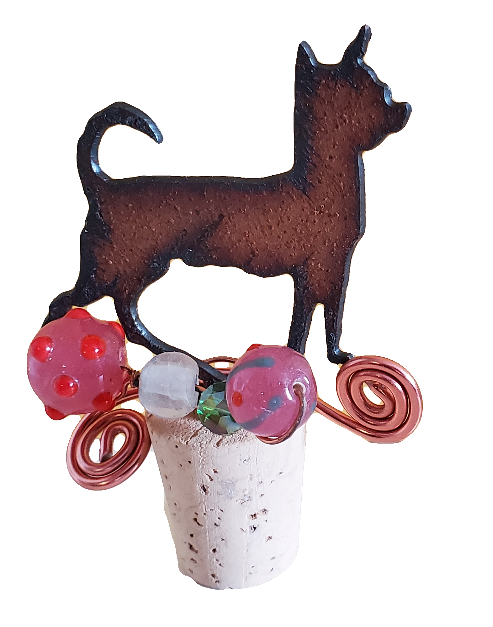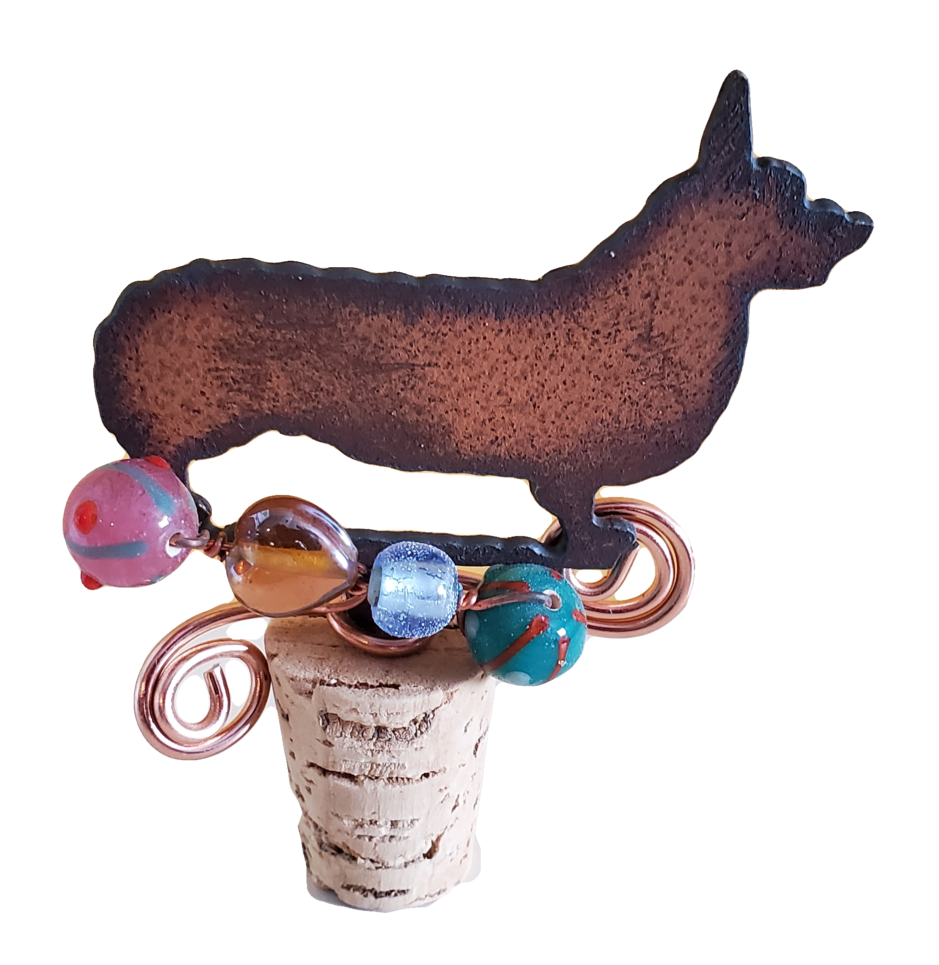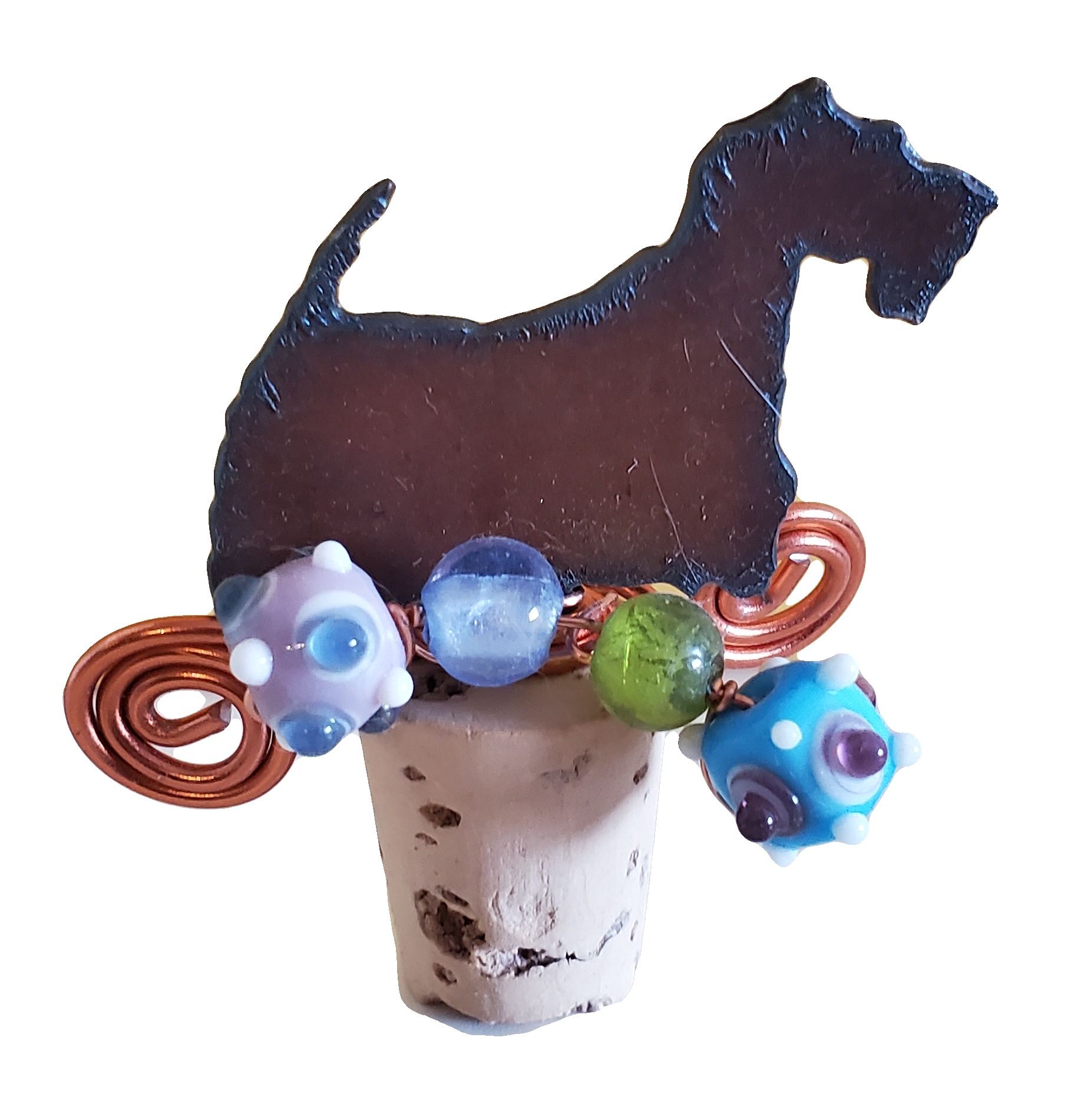 The cork wine bottle stopper has a rustic iron item and bead and copper decorations. The bottle stopper is about 3″ tall. Available with a variety of dog breeds. Unique gift.