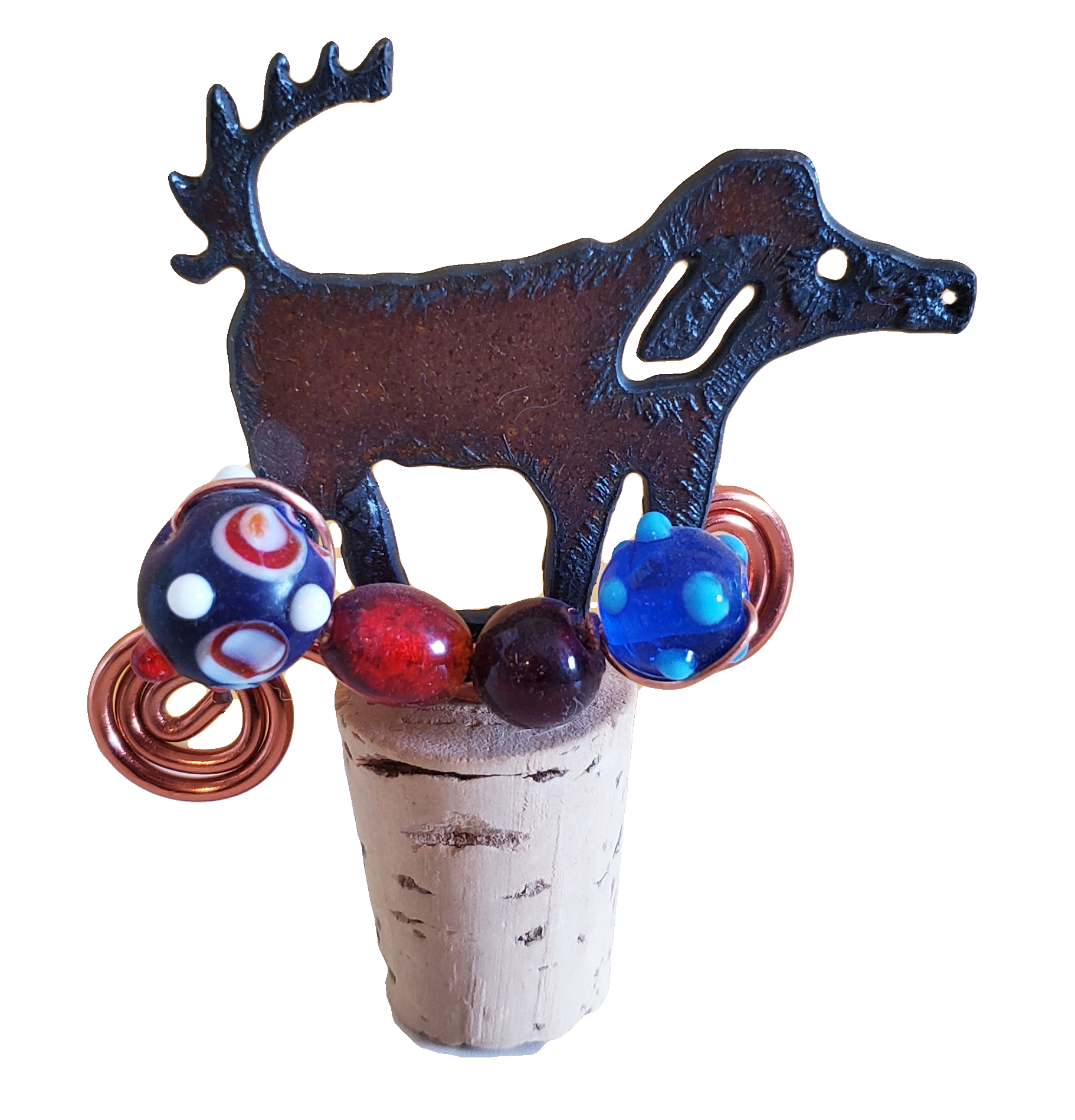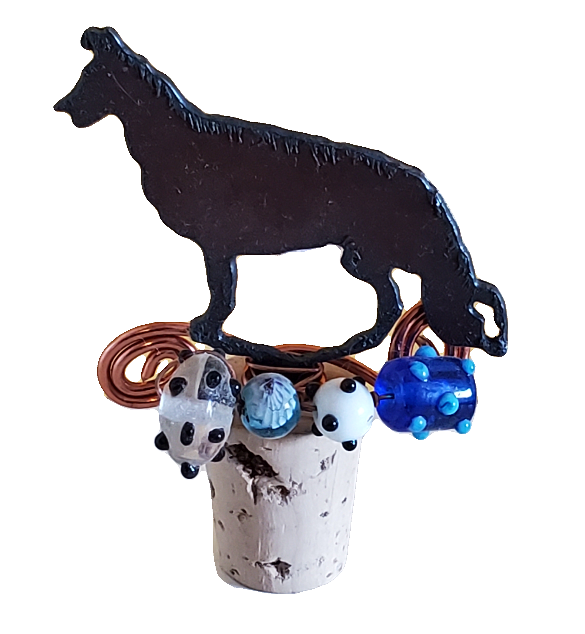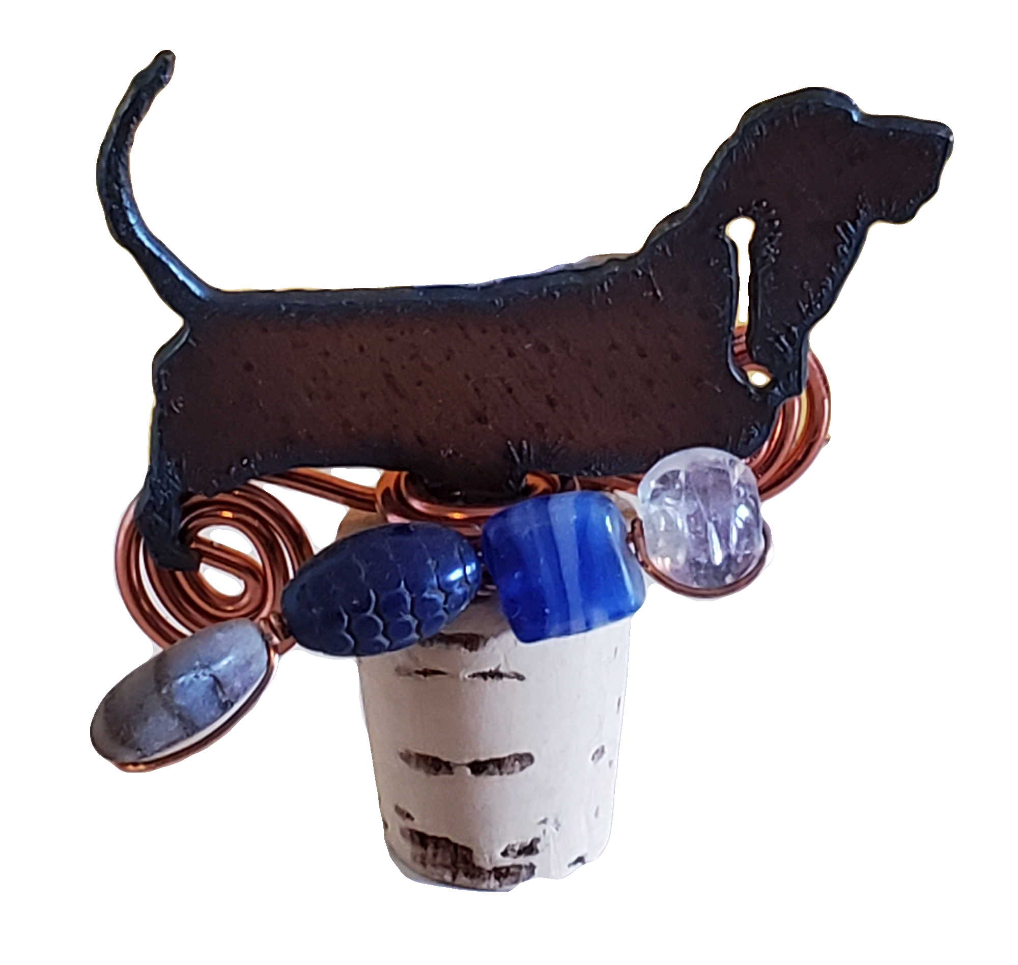 The cork wine bottle stopper has a rustic iron item and bead and copper decorations. The bottle stopper is about 3″ tall. Available with a variety of dog breeds. Unique gift.