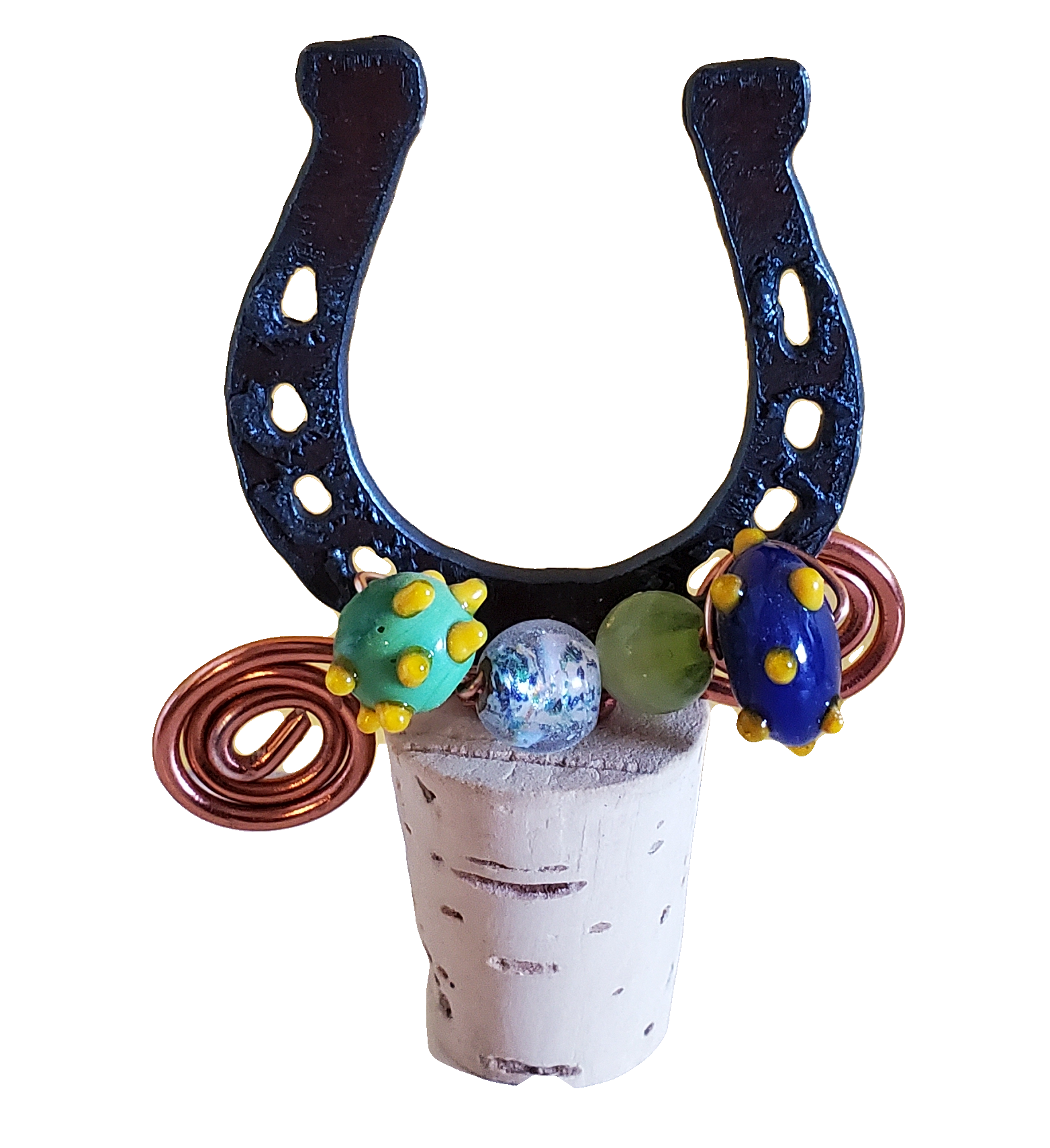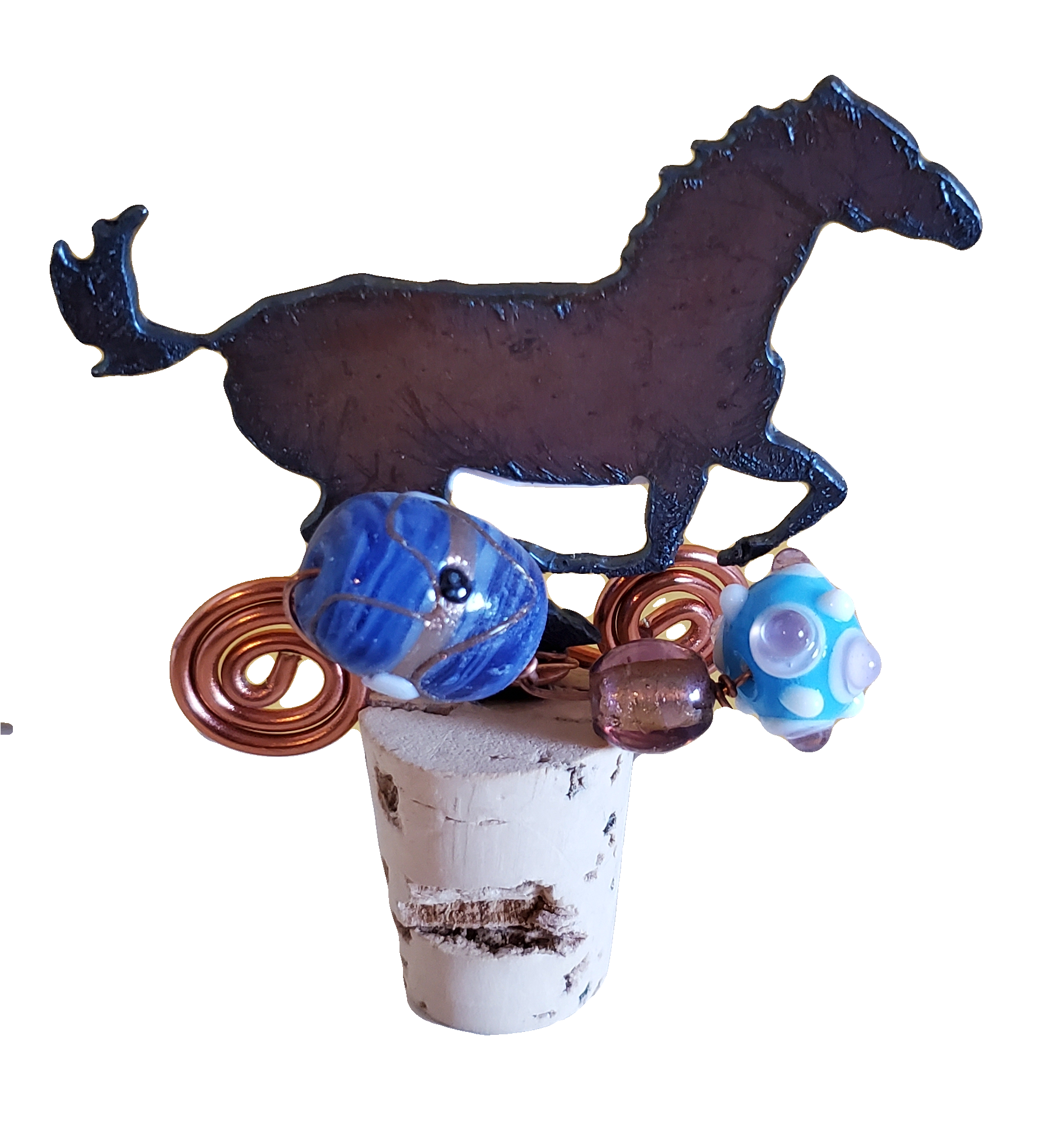 The cork wine bottle stopper has a rustic iron item and bead and copper decorations. The bottle stopper is about 3″ tall. Available with either a running horse or a horseshoe. Unique gift.