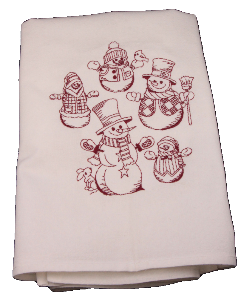 The flour sack dish towel is 100% white cotton. The actual size 30 X 30 inches. The towel is custom embroidered with several dressed up snowman. Unique gift.