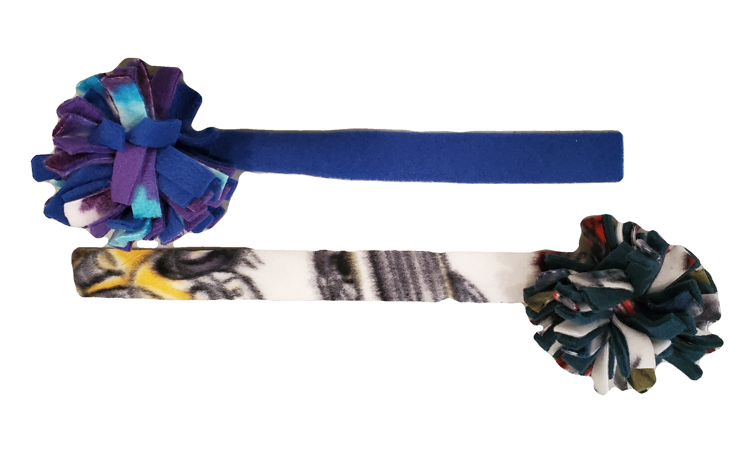 This is a soft fleece cat toy with a strap to play with your cat. The ball is about 4 inches in diameter and a 10 inch handle. It is available in a variety of designs.