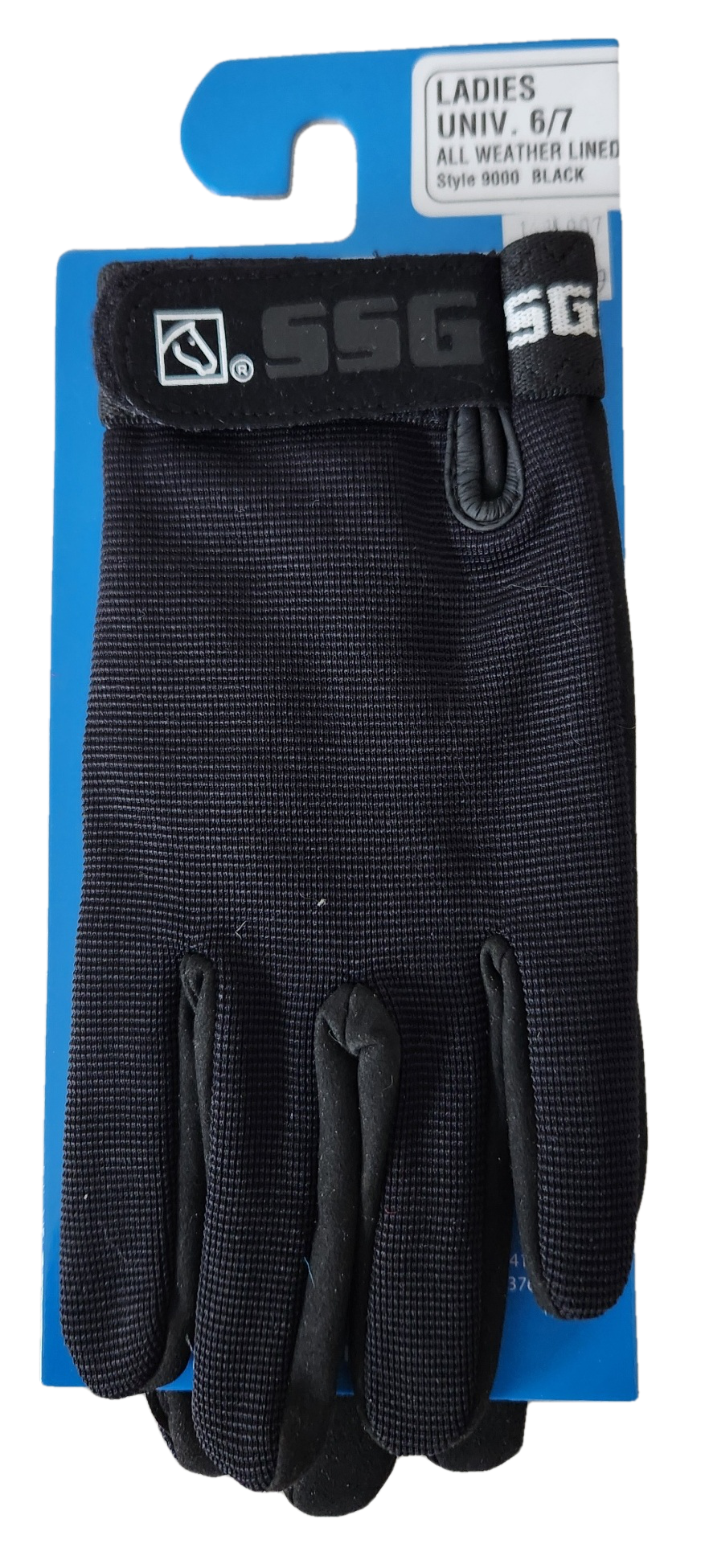 SSG All-Weather Lined Gloves are excellent for winter exercising or arena riding. Unlined Aquasuede palm is soft, colorfast, sweat absorbing, and breathable. Thinsulate lining on back of hand and thumb provides 1 1/2 times the warmth of down, and about twice the warmth of other high loft insulation materials. Hook and loop wrist closure. Excellent grip any weather condition. Product Features: