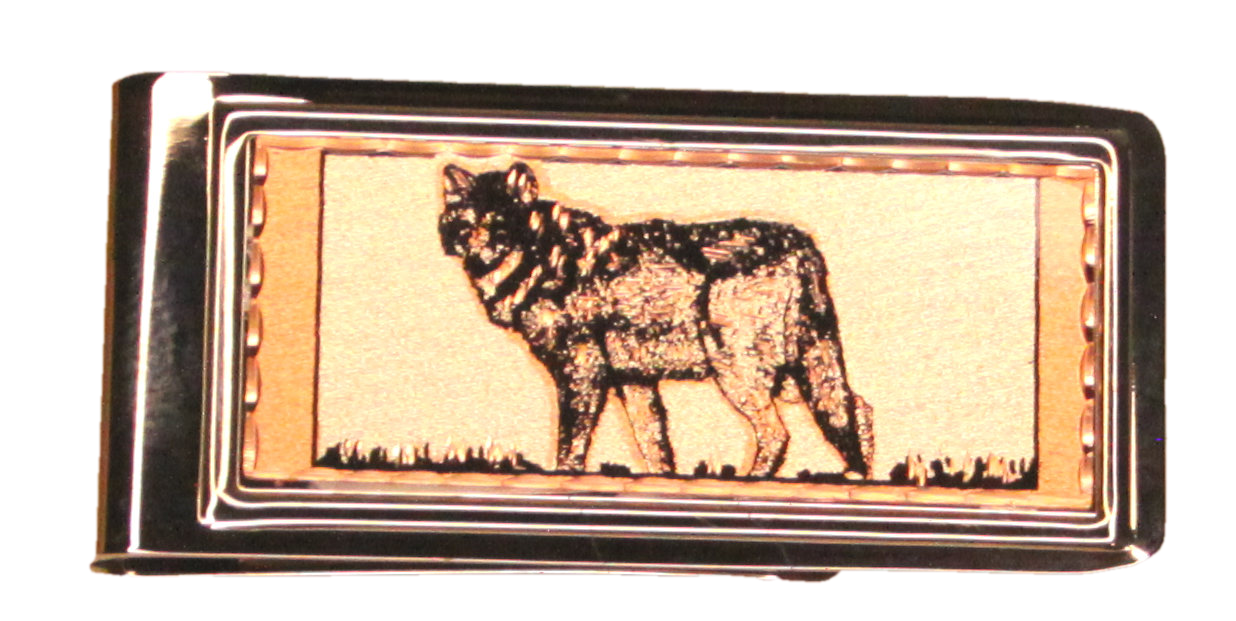 Metal money clip has a standing wolf design on the front. Design is etched with copper accents. Comes in a small gift box. The clip is 1″ x 2 1/4″.