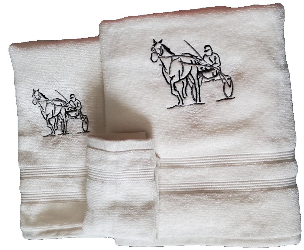 Embroidered bath towels featuring an embroidered Sulky Horse Driving. Towels are a soft, 100% cotton terry. Towels are a medium weight terry for best appearance of the embroidery. Designs are sewn in long lasting polyester thread.