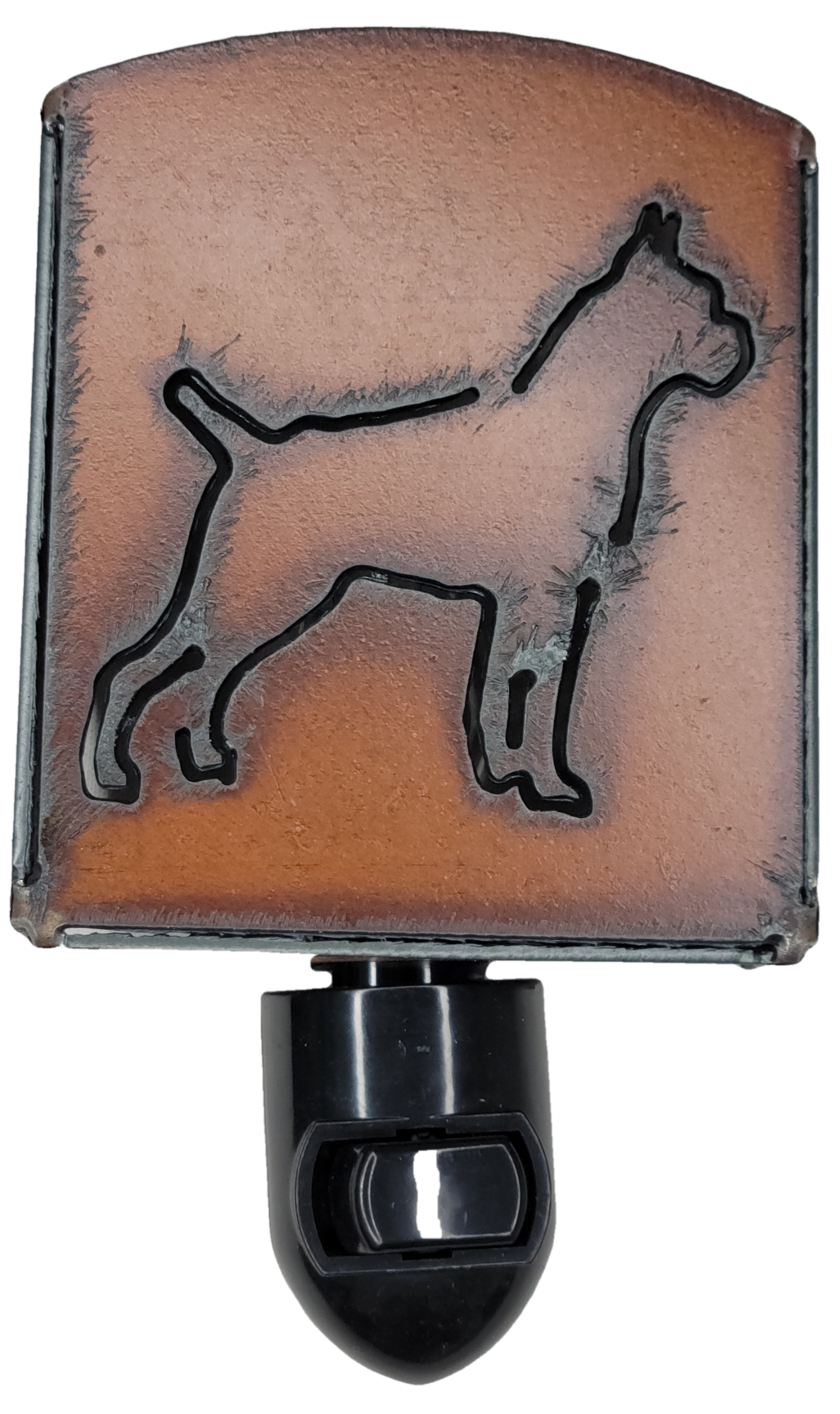 Rustic metal night light has a Boxer dog design.