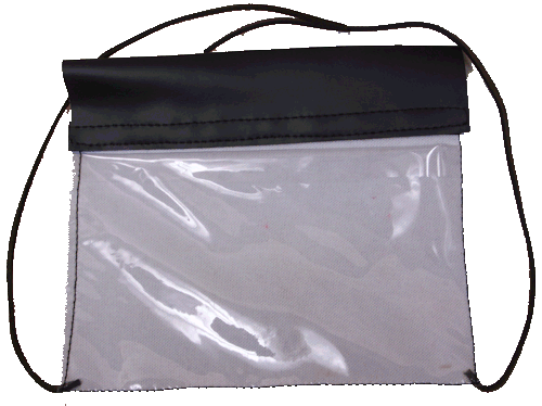 Vinyl time card or number holder. Has two strings for attaching to carriage. Pouch with clear plastic window for number. The carriage number holder measures 10 1/2 inches wide by 8 inches tall. Window is 7 1/2 inches tall by 4 5/8 inches tall. Will hold a number card measuring up to 8 x 9 inches.