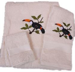 Embroidered bath towels featuring an embroidered Toucan. Designs are done on a soft, 100% cotton terry. Towels are a medium weight terry for best appearance of the embroidery. Designs are sewn in long lasting polyester thread.
