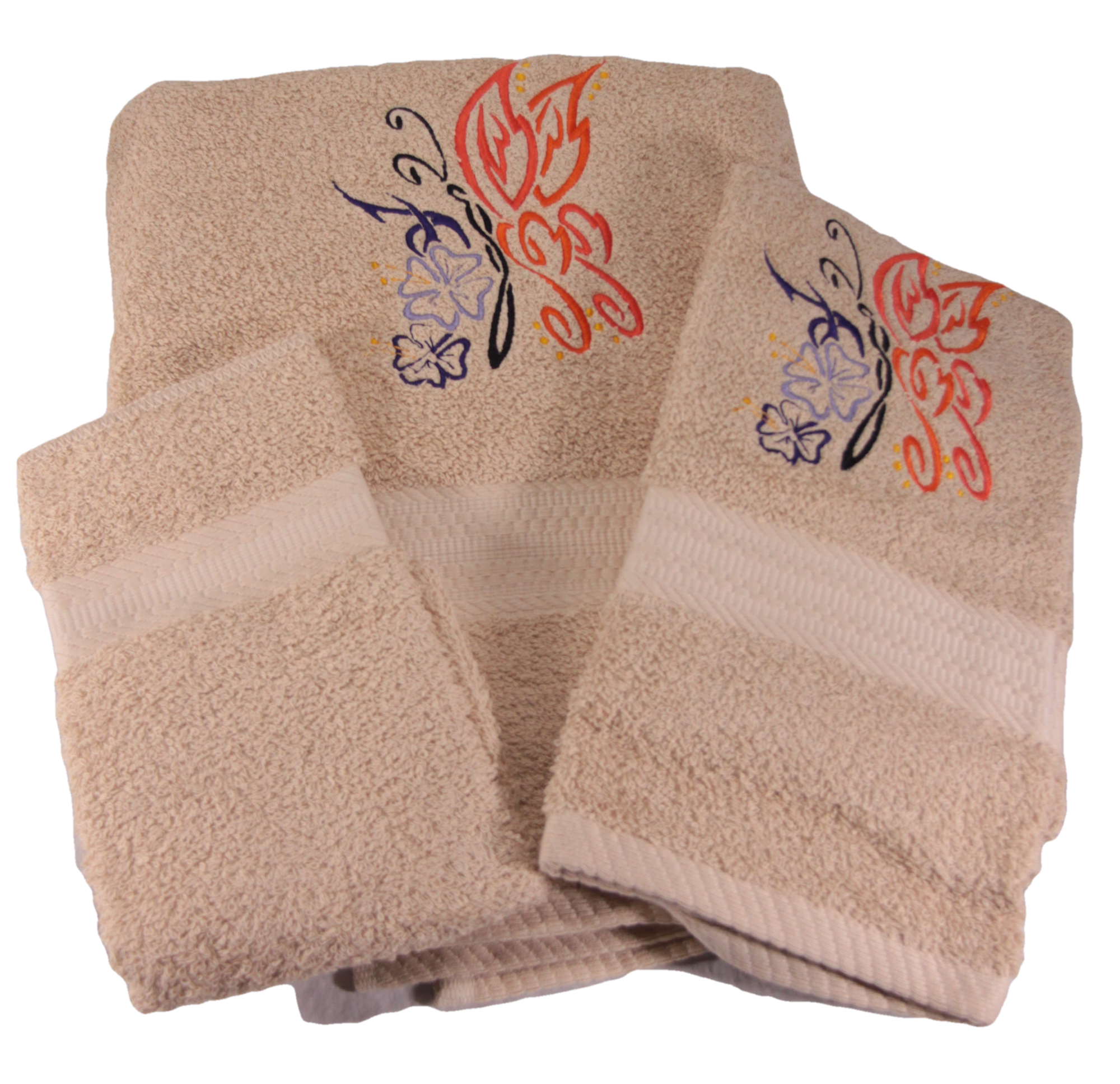 Embroidered bath towels featuring an embroidered tribal designed butterfly. Designs are on a soft, basic, 100% cotton terry bath towel set. Towels are a medium weight terry for best appearance of the embroidery. Designs are sewn in long lasting polyester thread.