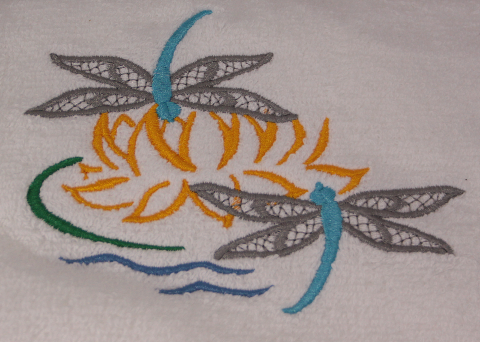 Two Dragonflies and a Lily on Embroidered Bath Towels
