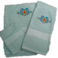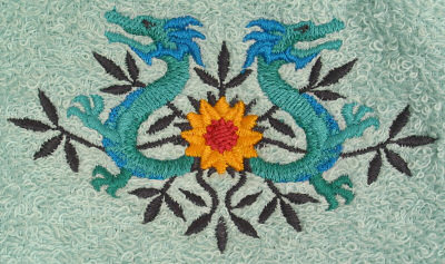 Embroidered bath towels featuring an embroidered Two Dragons With Flower. Designs are done on a soft, 100% cotton terry. Towels are a medium weight terry for best appearance of the embroidery. Designs are sewn in long lasting polyester thread.