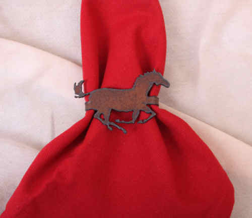 Metal running horse napkin ring is about 2″ x 3″ in size. The napkin ring is rustic brown metal. Made in the U.S.A. Combine with horse napkins for a unique table setting.