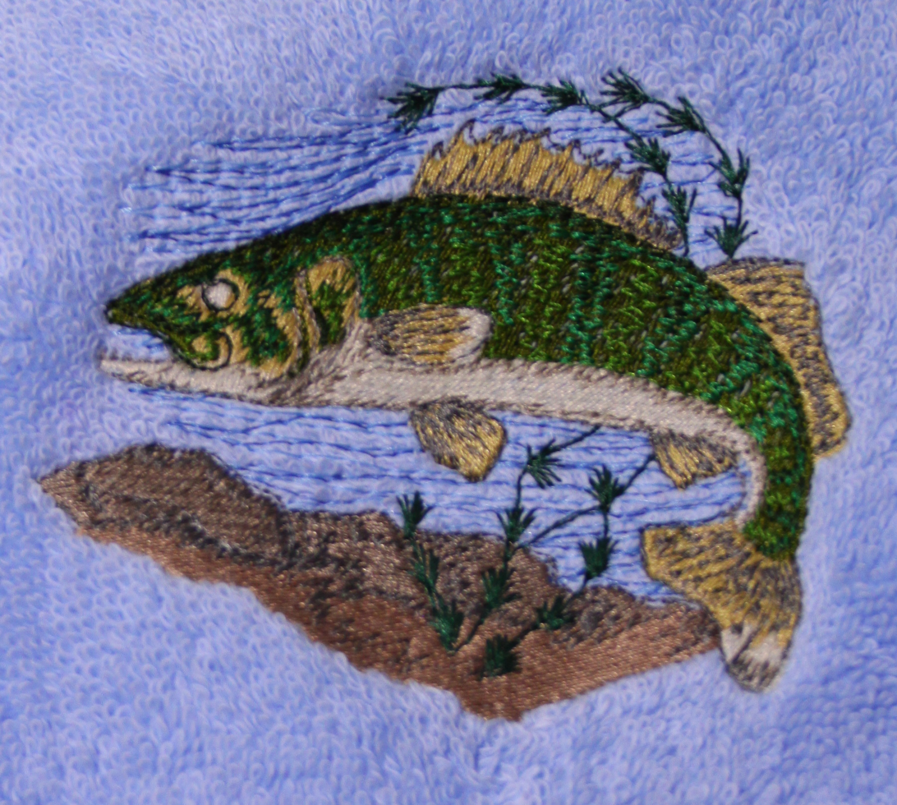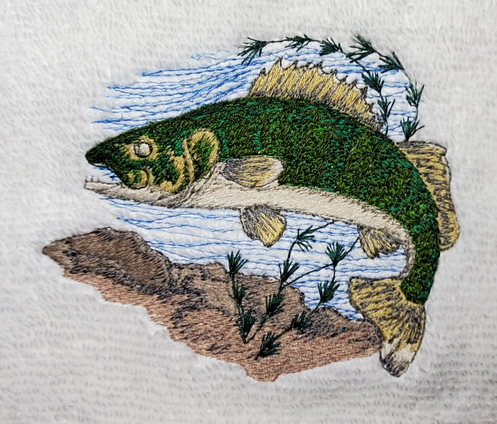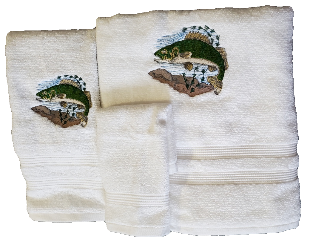 Embroidered bath towels featuring an embroidered swimming walleye fishing design. Designs are on a soft, basic, 100% cotton terry bath towel set. Towels are a medium weight terry for best appearance of the embroidery. Designs are sewn in long lasting polyester thread.