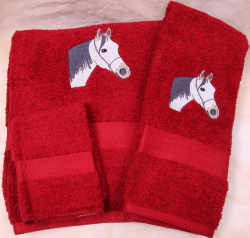Embroidered bath towels feature an embroidered white horse head. Designs are on a soft, basic, 100% cotton terry. Towels are a medium weight terry for best appearance of the embroidery. Designs are sewn in long lasting polyester thread.