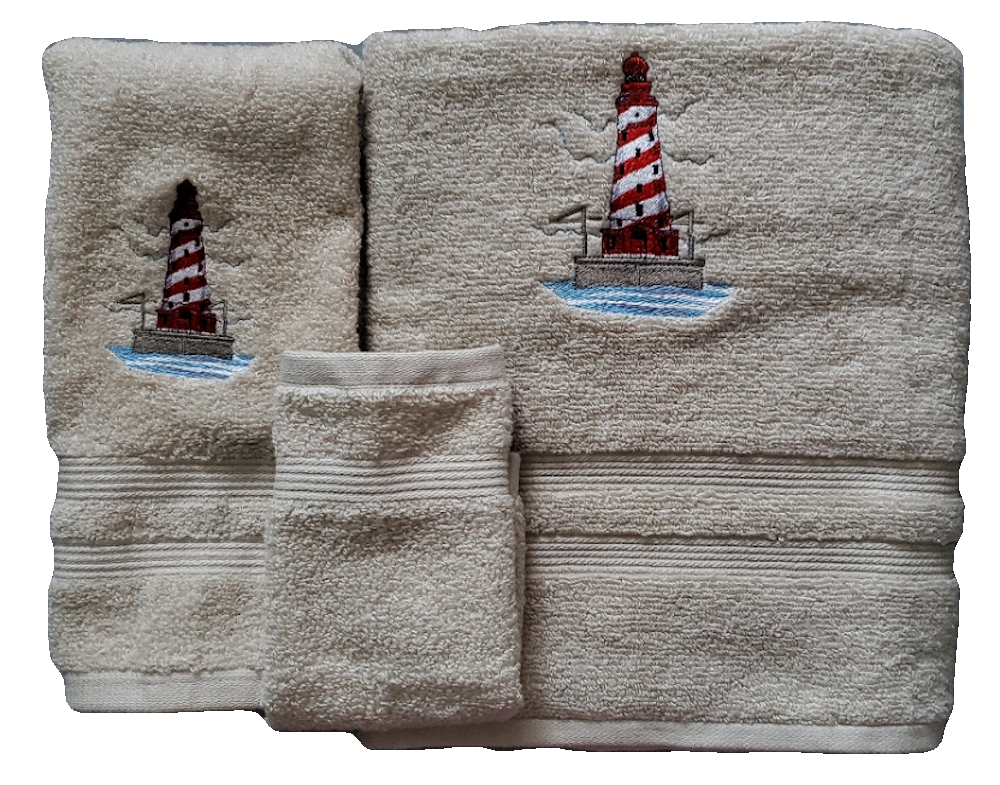 Embroidered bath towels featuring an embroidered White Shoal Lighthouse. Designs are done on a soft, 100% cotton terry. Towels are a medium weight terry for best appearance of the embroidery. Designs are sewn in long lasting polyester thread.