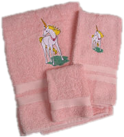 Embroidered bath towels featuring an embroidered White Unicorn. Soft, basic, 100% cotton terry bath towel set. Towels are a medium weight terry for best appearance of the embroidery. Designs are sewn in long lasting polyester thread.