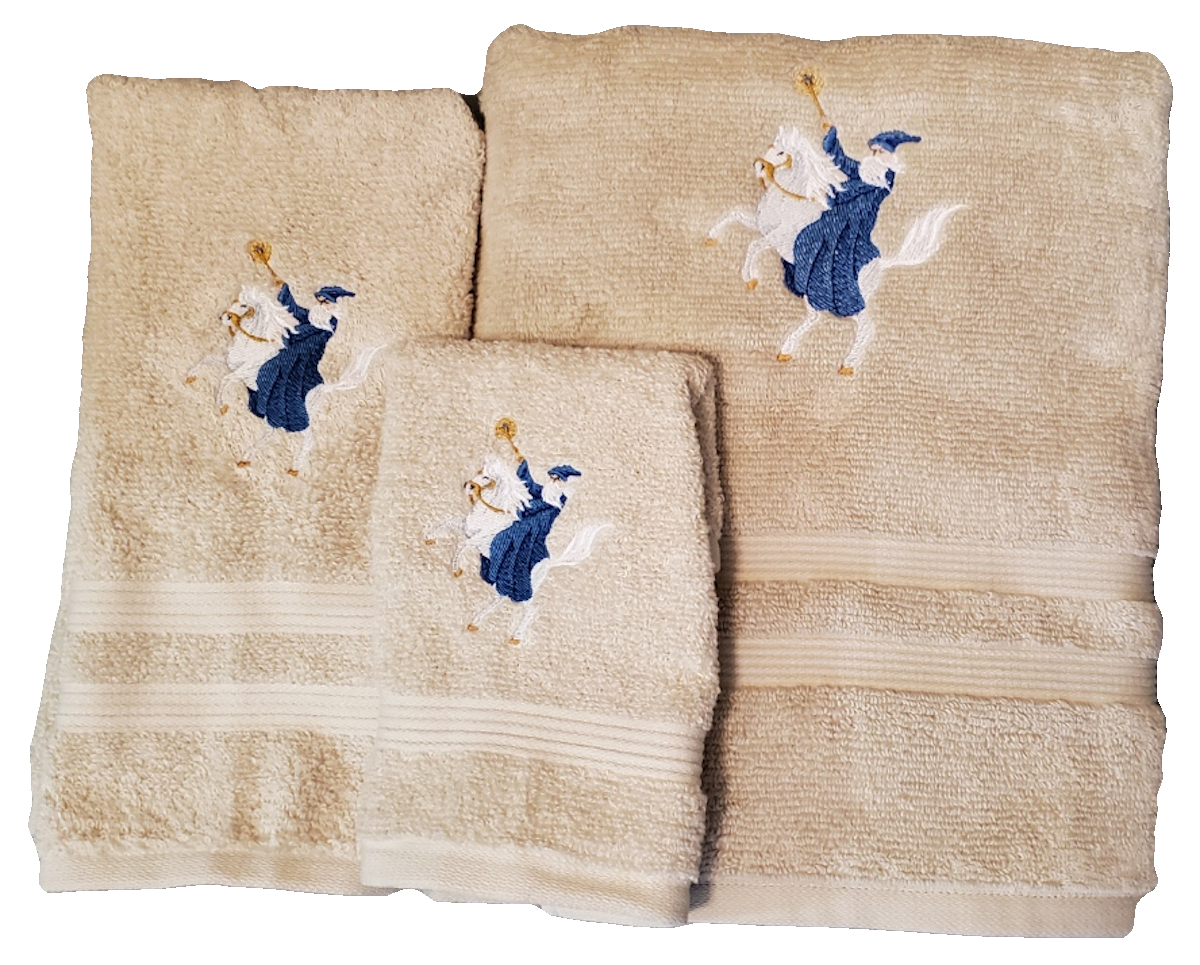 Embroidered bath towels featuring an embroidered Wizard On A White Horse. Soft, basic, 100% cotton terry bath towel set. Towels are a medium weight terry for best appearance of the embroidery. Designs are sewn in long lasting polyester thread.